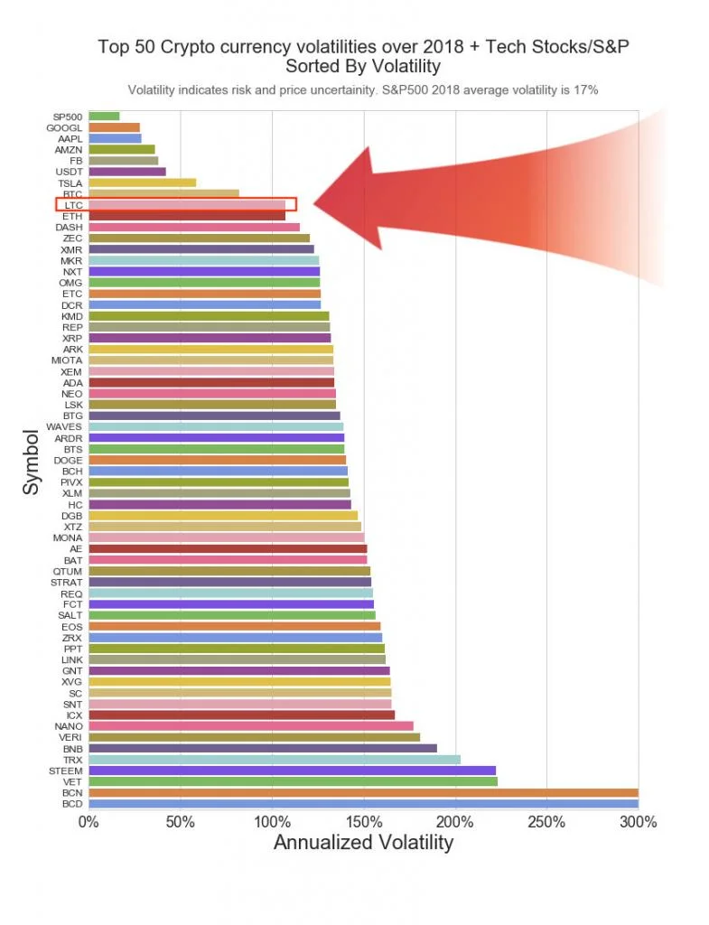 Vi har sammenlignet 50 top-kryptovalutaer og aktier i 2018. Nedenfor har vi sorteret alle efter volatilitet. Her ser vi, at Litecoin er en af kryptovalutaerne med lavest volatilitet →