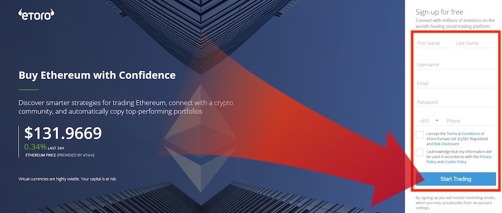 First step is to Open Your eToro Account. Follow this link, enter your information, and click on “Start Trading“! →