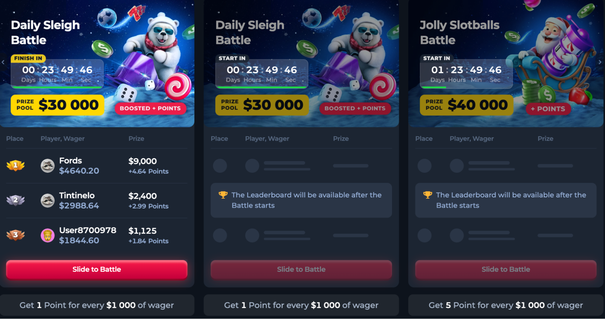 The total prize pool of Battles is $700 000. They occur during the Xmas Sleigh Race and cover various iGaming entertainment on the platform. The main reward of Battles is not only cryptocurrency but also points for winning the final race. One point is equal to $1 000 of the total gaming wager. Let’s take a closer look at each of them.