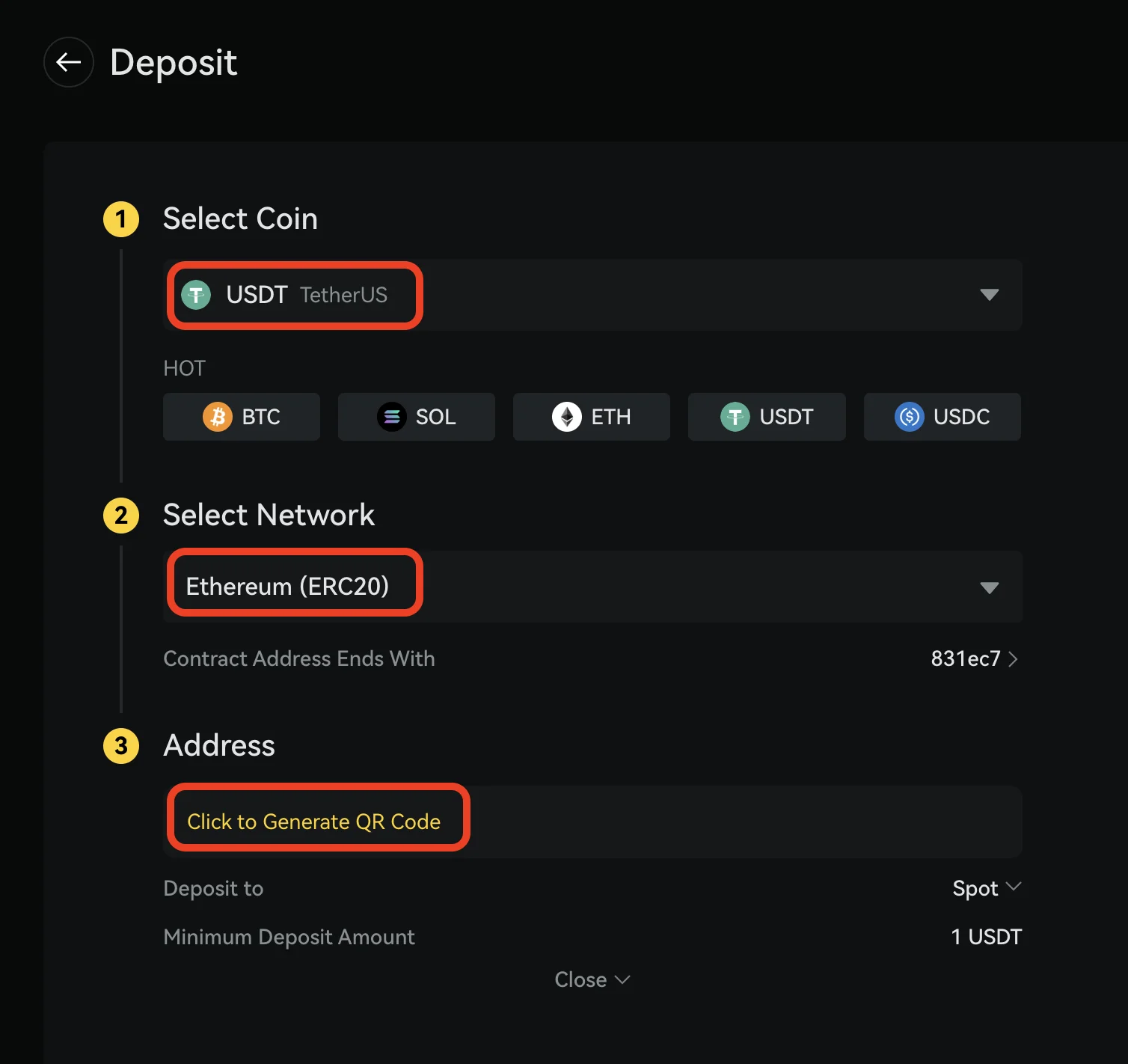 - Next step is to click “Click to Generate QR Code” to show your public crypto address. Copy the address from BYDFi and paste it into your external wallet or other exchanges. Input the tag if required. Without the tag, the transfer might fail.