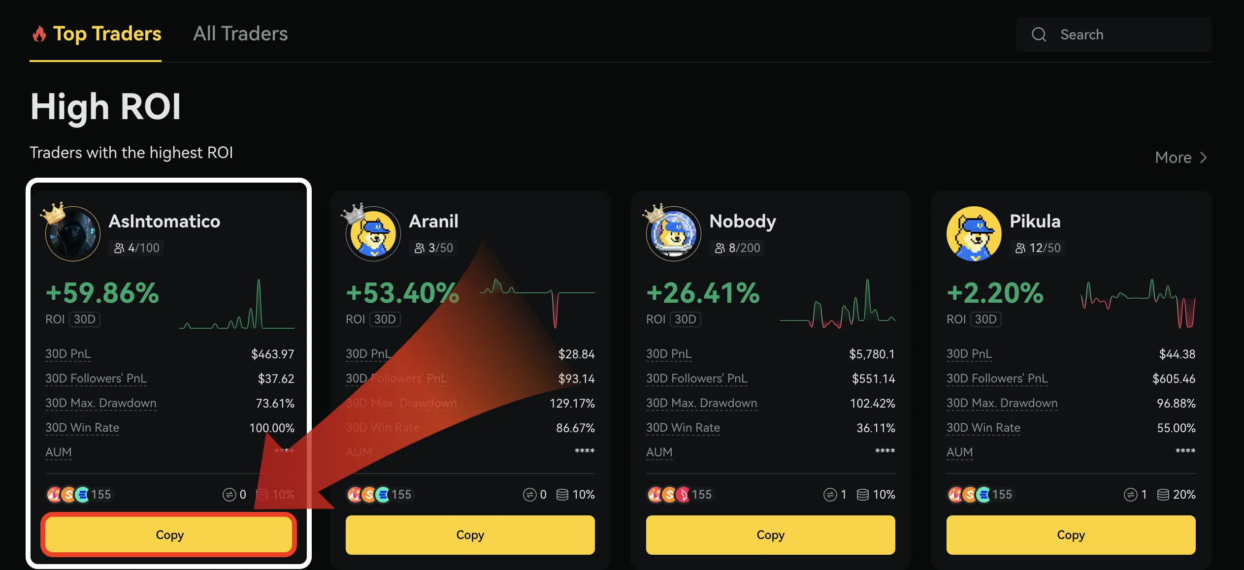 Example: Below is shown some of the top traders during a specific time at the end of 2025. As you can see, “AsIntomatico” has made a total return on investment (ROI) of almost 60% over the past 30 days. By clicking “Copy” you will automatically copy this person’s trading in real time.