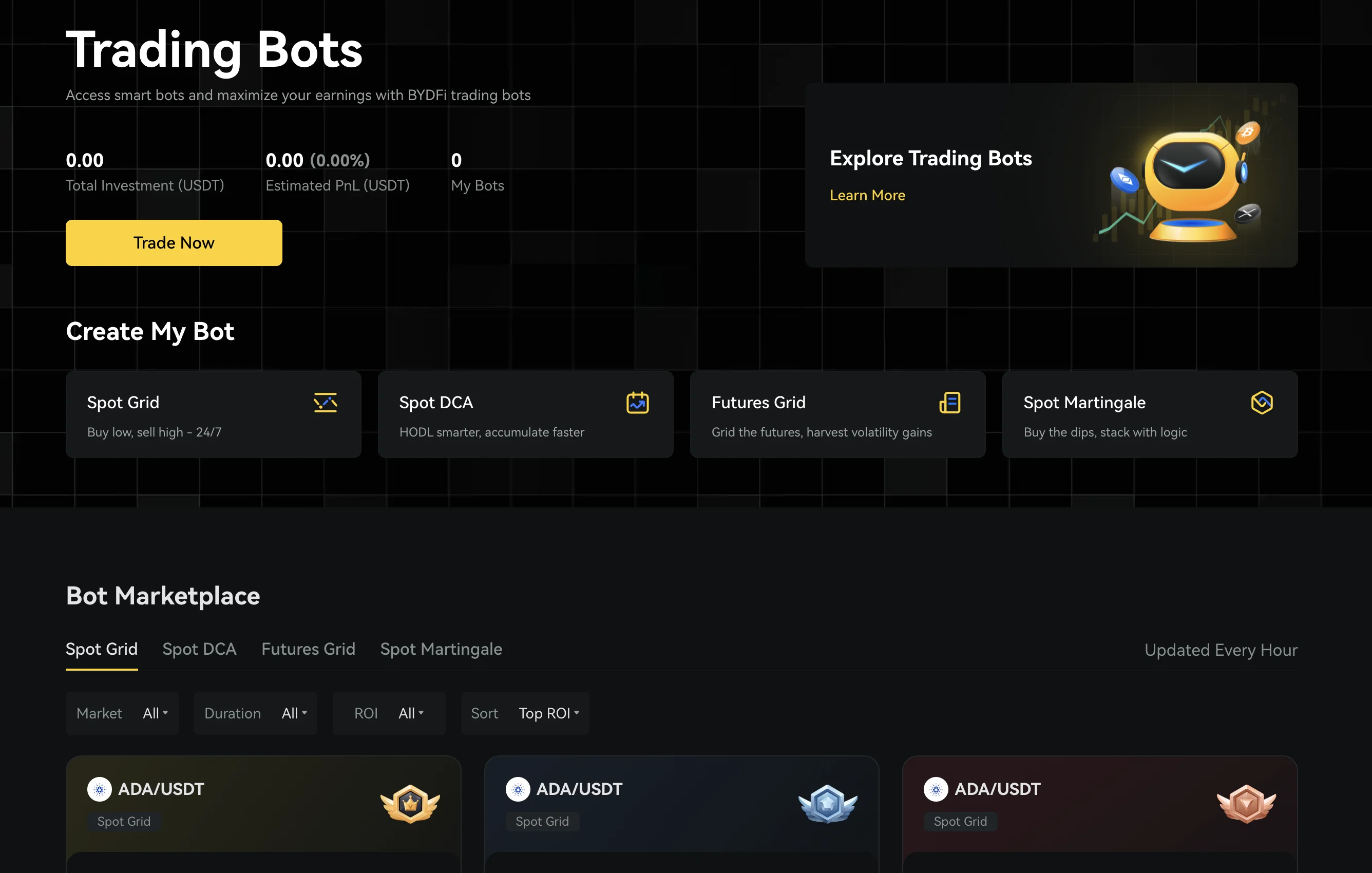 - Spot investment – Bots that help you accumulate coins by buying at regular intervals or within a price range.
