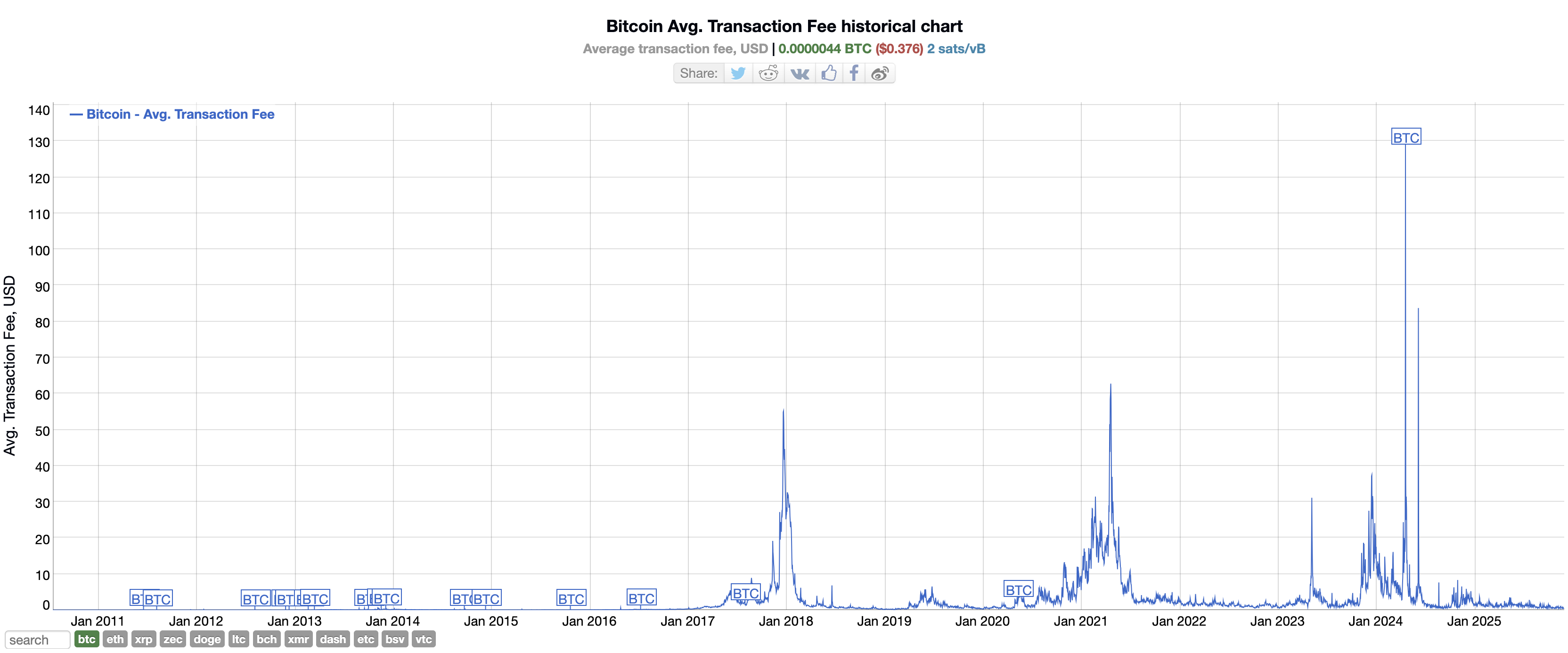 The chart below shows the average network fee on the Bitcoin blockchain. As we can see, the fee was especially high during the bull markets, such as 2017/2018, 2020/2021 and 2024. This is normal when prices start to rise quickly. During the last bull run, the fee reached as high as 130 USD per transaction (see image below).