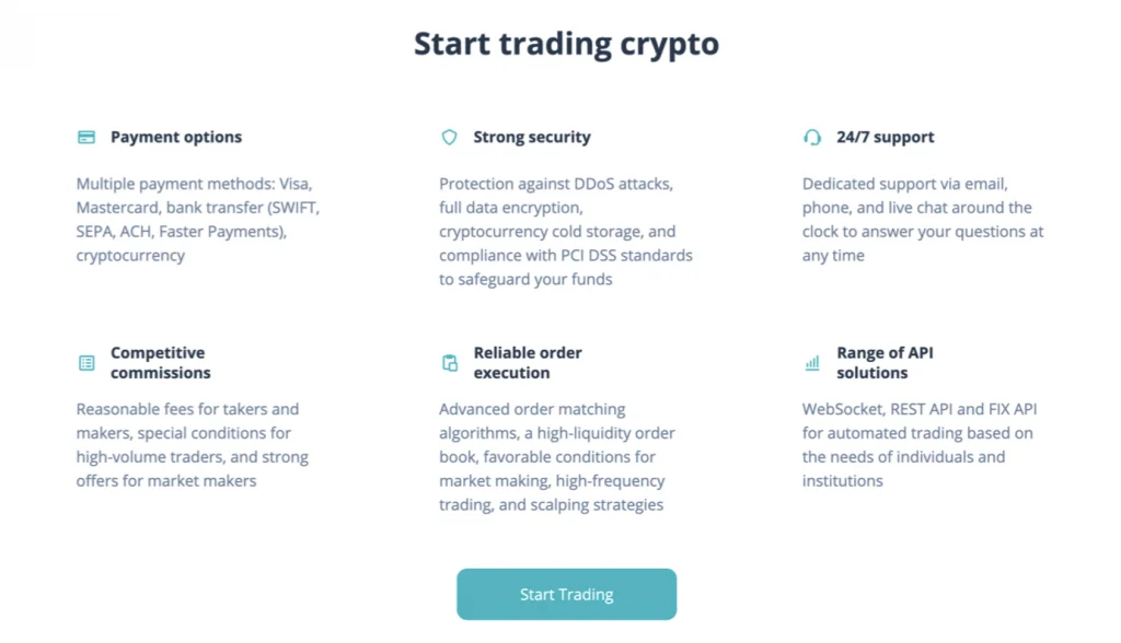 Above we have listed different payment methods to deposit funds into your account. Deposits can be done with credit or debit cards, SWIFT, ACH, Faster Payments, Skrill, SEPA transfer, and, of course, cryptocurrencies. As you can see in the price table, funds available, deposit fees and buying limits vary depending on the payment method you choose. Fiat currencies supported are USD, EUR, GBP, and RUB, but deposits can be made with any currency.