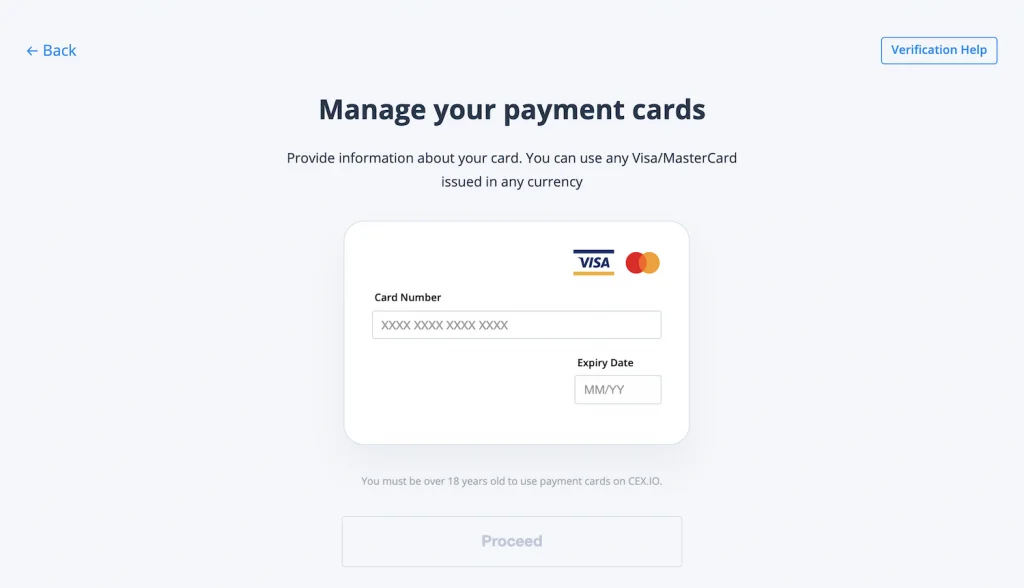 - Cards: You can add your credit/debit cards on this page. Here you manage all your credit/debit cards that are linked to your CEX.io account. There are not many Bitcoin exchanges that accept payment with Visa/MasterCard.