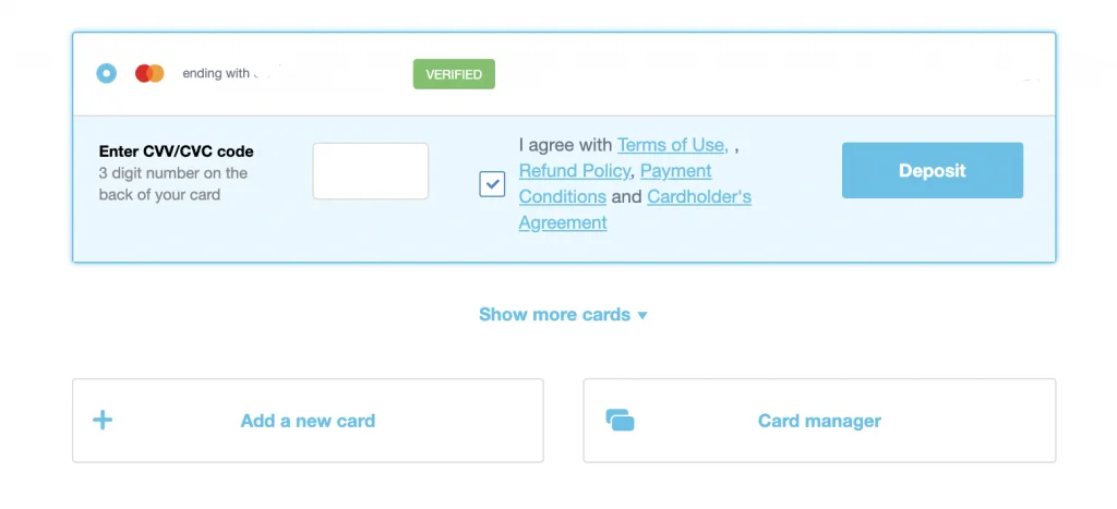 When making a deposit or buying crypto, you need to enter the CVV/CVC number on the back of your credit/debit card to verify that you have your payment card.