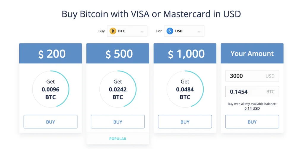 Deposits can be done by credit or debit card, Skrill, SWIFT, ACH, Faster Payments, SEPA transfer, and, of course, with other cryptocurrencies. There is no fee for transferring money to your account with a bank transfer, but it may take additional processing time. Otherwise, you can buy bitcoin and cryptocurrency instantly with your VISA/MasterCard. This is the easiest way to buy bitcoin and is recommended for beginners. The fee for buying with a credit/debit card depends on which currency you use. If you use a card in your local currency – there can be some exchange fee charged by your bank. In the fees and limits section above, there is a price table and more information. Below we have made a tutorial on how to buy bitcoin with credit/debit card.