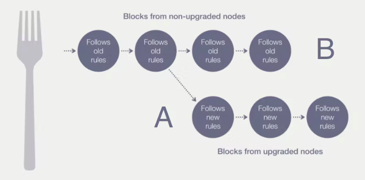 Bilden nedan illustrerar hur en fork inom krypto går till, vilket alltså inte är möjligt inom Algorand.