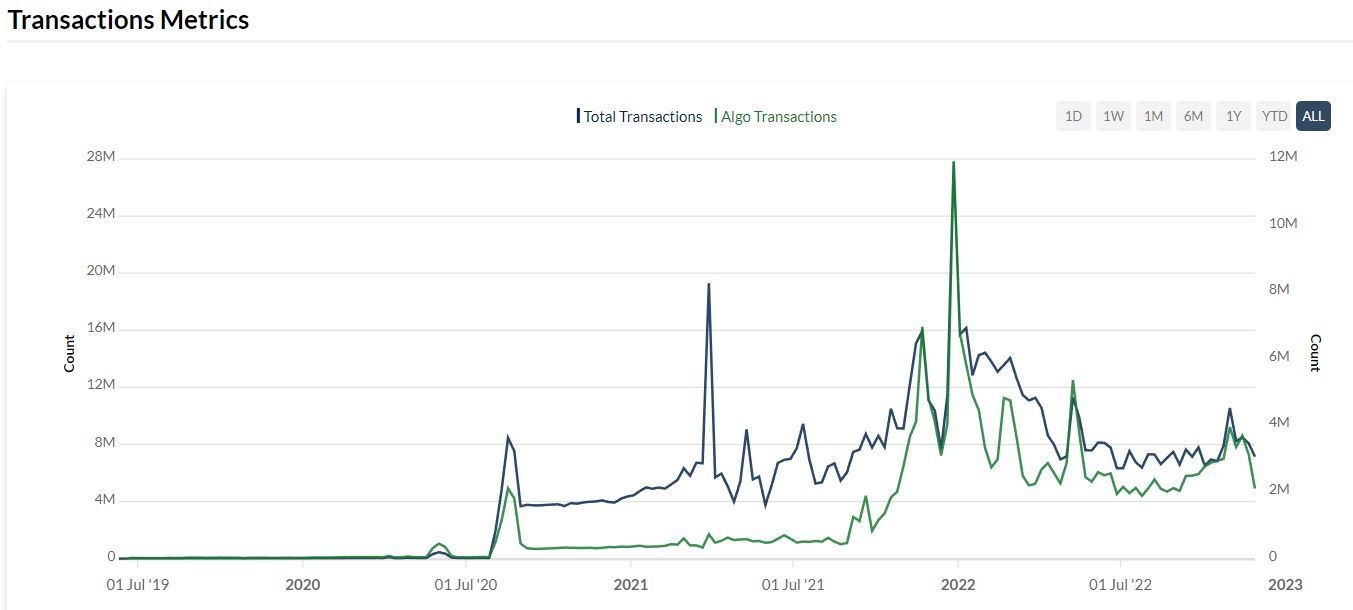 - Få användare – I början av 2023 fanns det nästan 30 miljoner plånböcker på Algorands blockkedja. Det kan jämföras med att Ethereum vid samma tillfälle hade 214 miljoner plånböcker och att det i genomsnitt skapades 166 000 nya plånböcker per dag. Eftersom Algorand är en ”konkurrent” till Ethereum bör därmed deras användarantal ställas mot varandra. Se aktuella siffror på Algoexplorer och Etherscan.