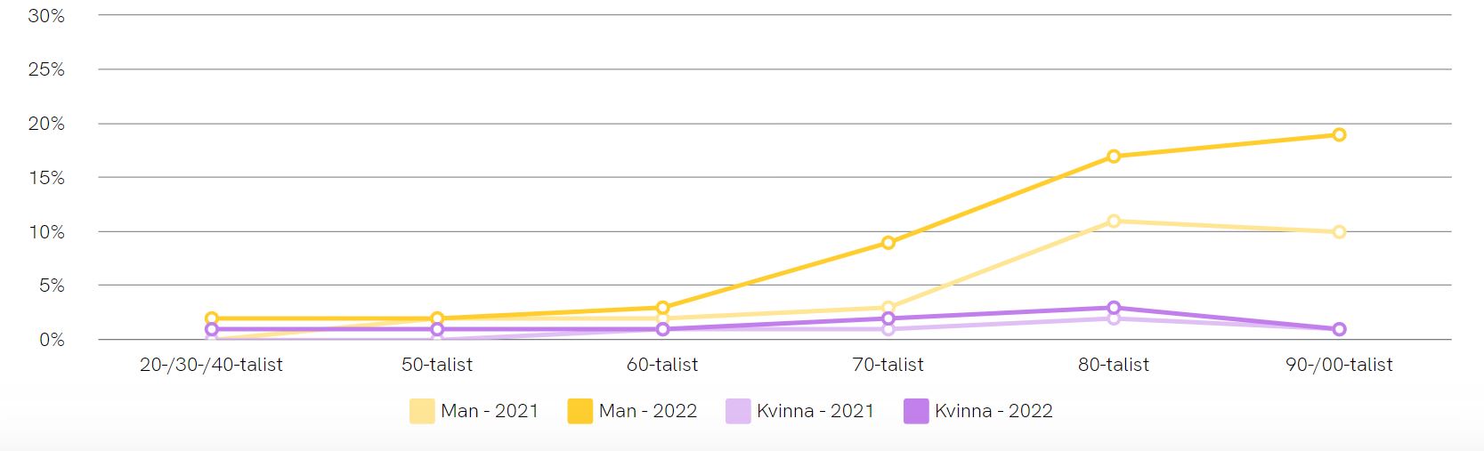I Sverige fördubblades antalet personer som handlat med kryptovalutor mellan 2021 och 2022. Detta enligt den årliga undersökningen Svenskarna och Internet. År 2022 var det 6 % av alla internetanvändare som hade handlat, eller använt, kryptovalutor. Ökningen visas tydligt i grafen nedan. Det går även att se en tydlig skillnad på handel mellan män och kvinnor.