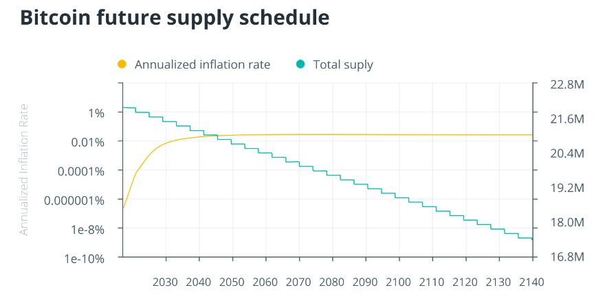 Som grafiken visar nedan ökade antalet bitcoin, per år, mest i början varpå det successivt minskar fram till att totala utbudet är uppnått år 2140.