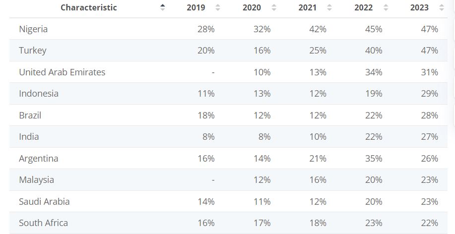 Nedan visas statistik, från Statista.com, som visar andelen av befolkningen som äger, eller använt, kryptovalutor. I de flesta länder, där adoptionen är hög, har andelen mer än fördubblats sedan 2020.