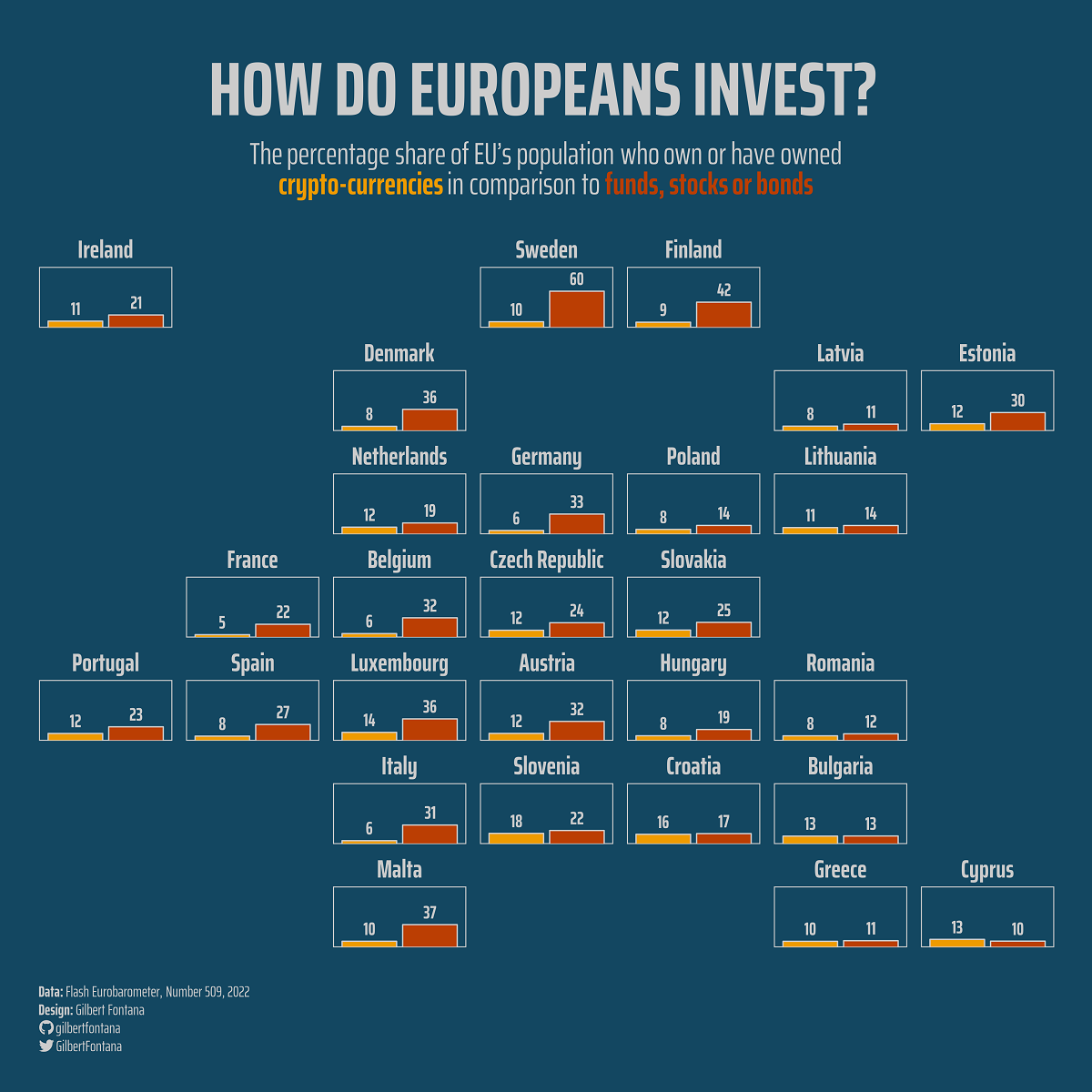 Även World Economic Forum visar på liknande utveckling. I artikeln ”Crypto popularity across the EU”, från 2023, visas att 12 % av invånarna i Slovenien äger kryptotillgångar. Samtidigt visas en tydlig skillnad mellan hur adoptionen skiljer sig mellan de starkaste ekonomierna och de svagare.