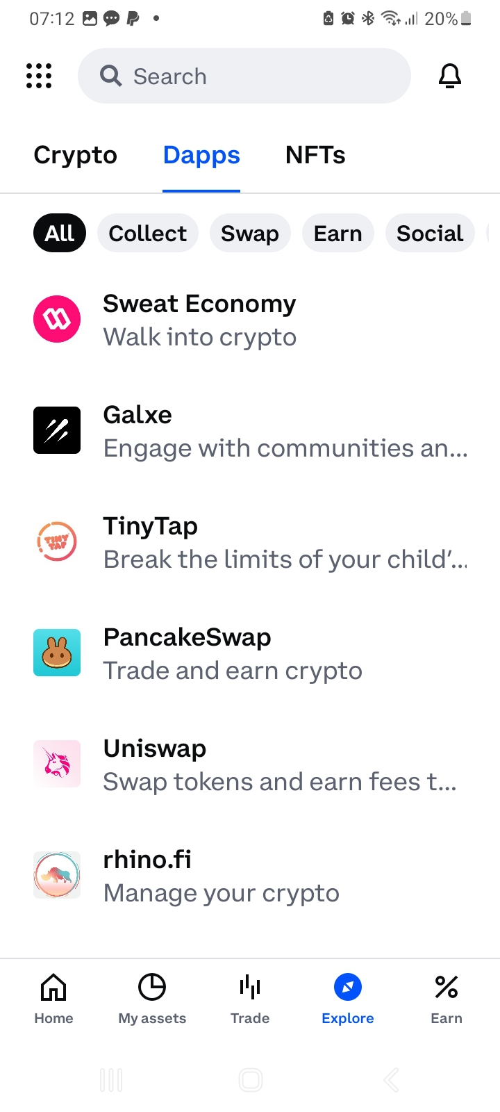 Klicka på ”Explore” och sedan ”Dapps” för att se decentraliserade appar som Coinbase kan interagera med. Bland dessa finns exempelvis Uniswap och Pancake Swap samt OpenSea. Se exempel på bilden nedan.