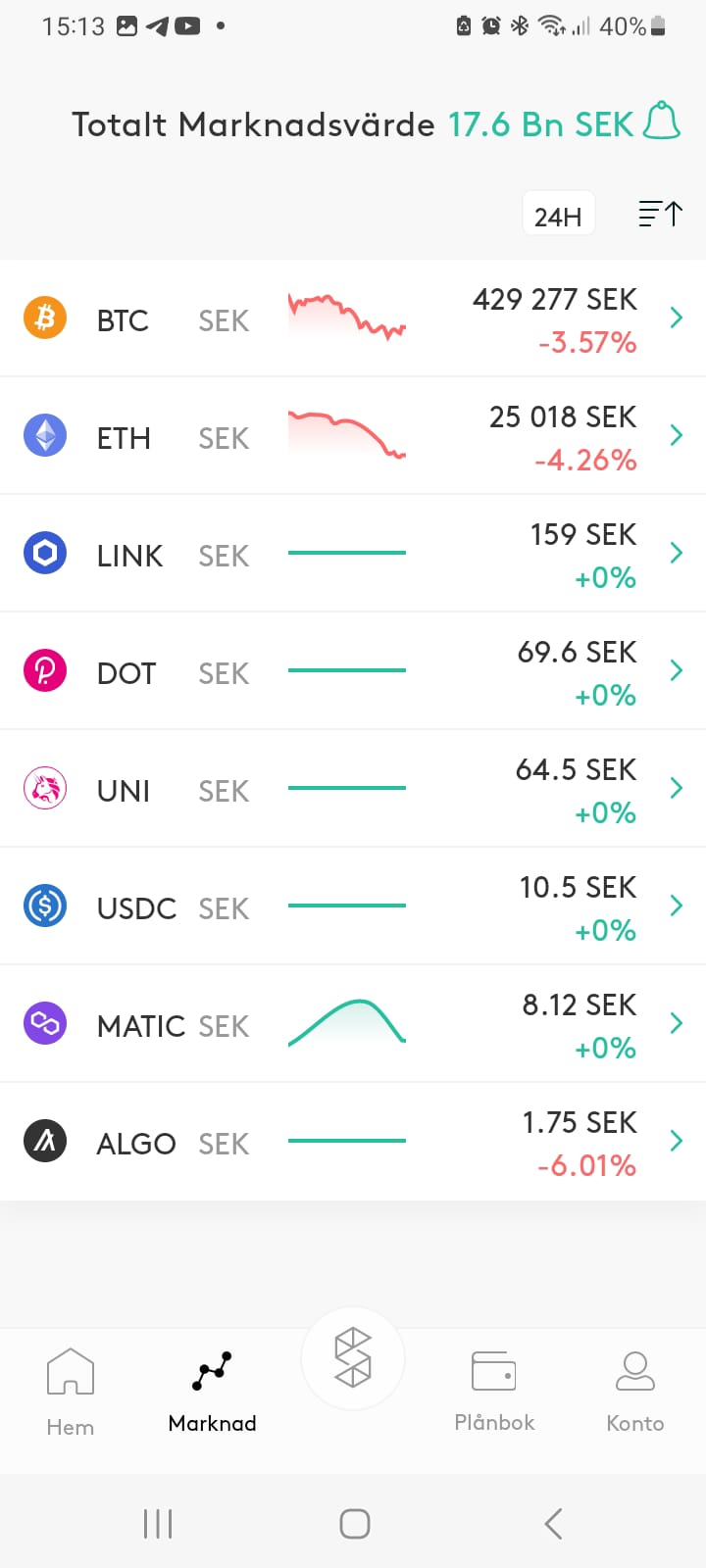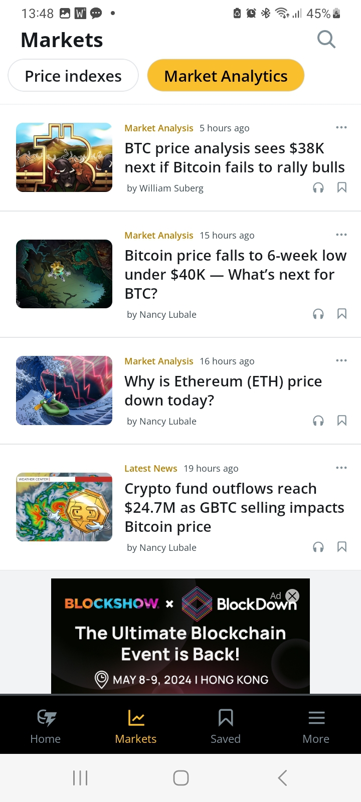 När appen öppnas presenteras de senaste nyheterna inom kryptobranschen. Generellt publiceras ett par artiklar per timme.