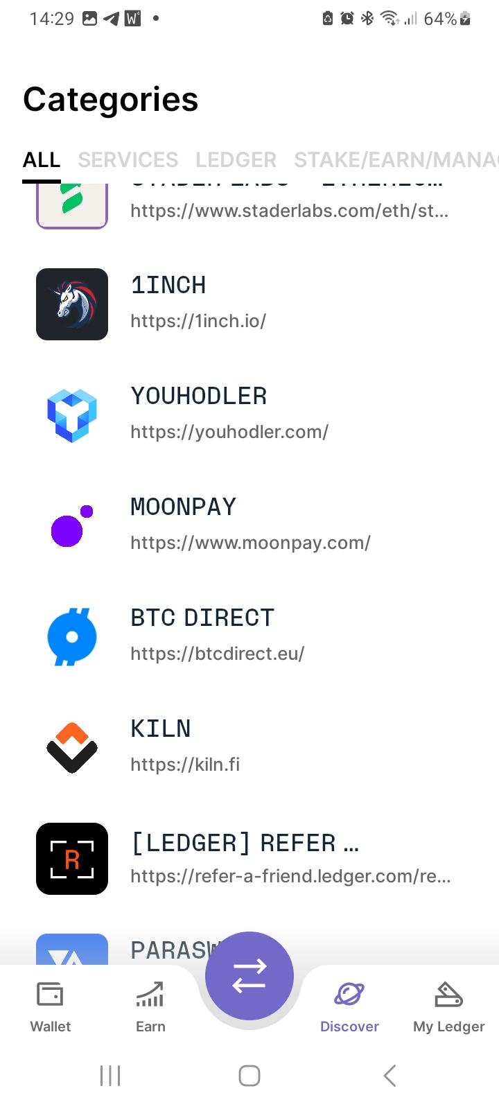 Klicka på ”Discover” och se applikationer som Ledger Live kan interagera med. Det är exempelvis decentraliserade börser, NFT-plattformar och stakingplattformar. Ännu ett alternativ är att ansluta Ledger till Metamask och på detta sätt nå ytterligare DeFi-projekt.