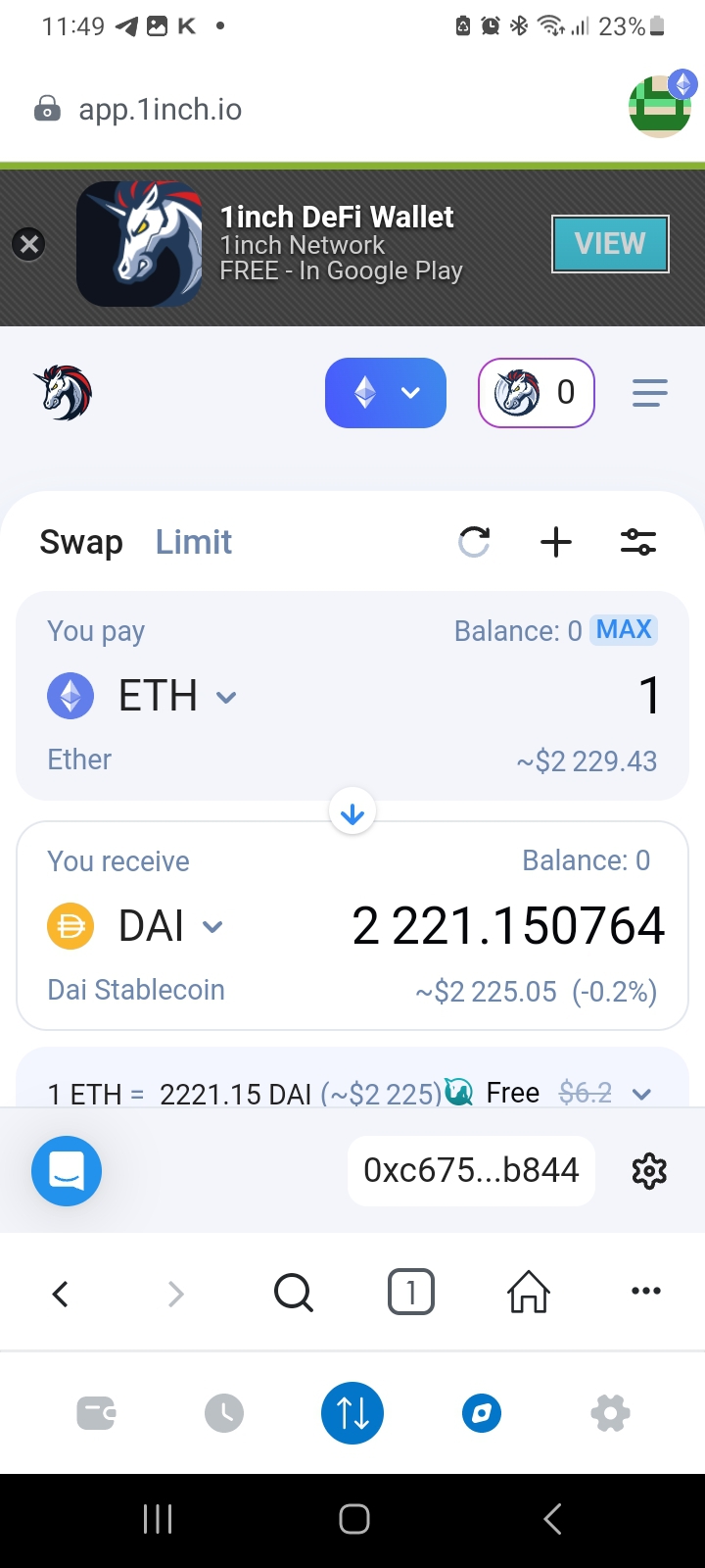 På bilden nedan visas ett exempel på integrering med DeFi. Via appen har anslutning skett till den decentraliserade DEX-aggregatorn 1Inch där en swap önskas genomföras mellan ETH och DAI. Genom dessa inbyggda integreringar kan ett flertal decentraliserade tjänster nås utan behov av att besöka tjänstens egen hemsida.