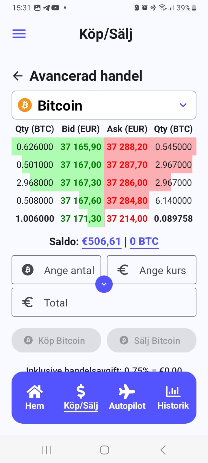 För dig som uppskattar orderbok finns ”Advanced Trade”, se bild nedan, där order kan läggas på valfri nivå i en klassisk orderbok.