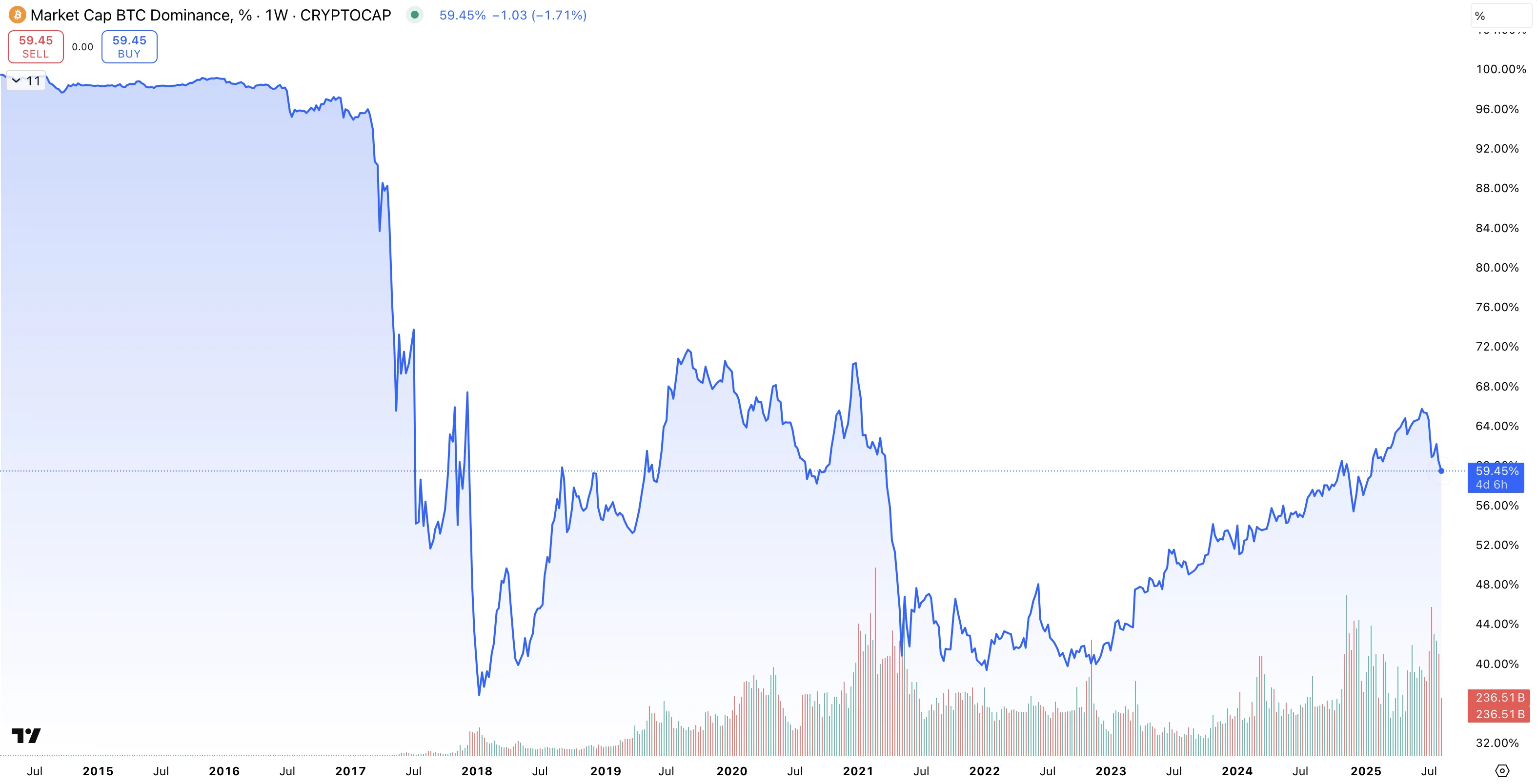 Nedan visas bitcoins dominans utifrån totalt marknadsvärde på samtliga kryptovalutor. Fram till 2017 stod bitcoin alltså för över 98 % av värdet på alla kryptovalutor tillsammans. Några få andra hade skapats men deras värde, tillsammans, var bara någon hundradel av det totala värdet på bitcoin.