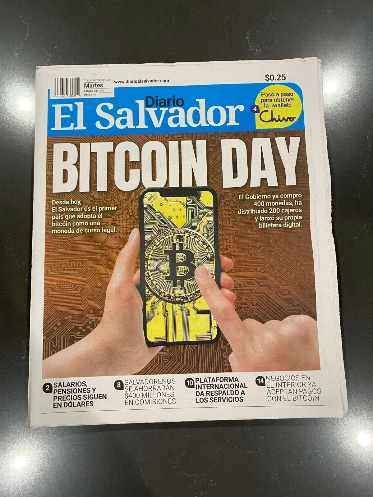 Nedan visas en tidning, från El Salvador, från den första dagen då bitcoin officiellt var landets valuta. Just denna tidning har fått ett högt affektionsvärde och är eftertraktad av många som tror att bitcoin kommer att växa kraftigt och tids nog bli en etablerad världsvaluta.