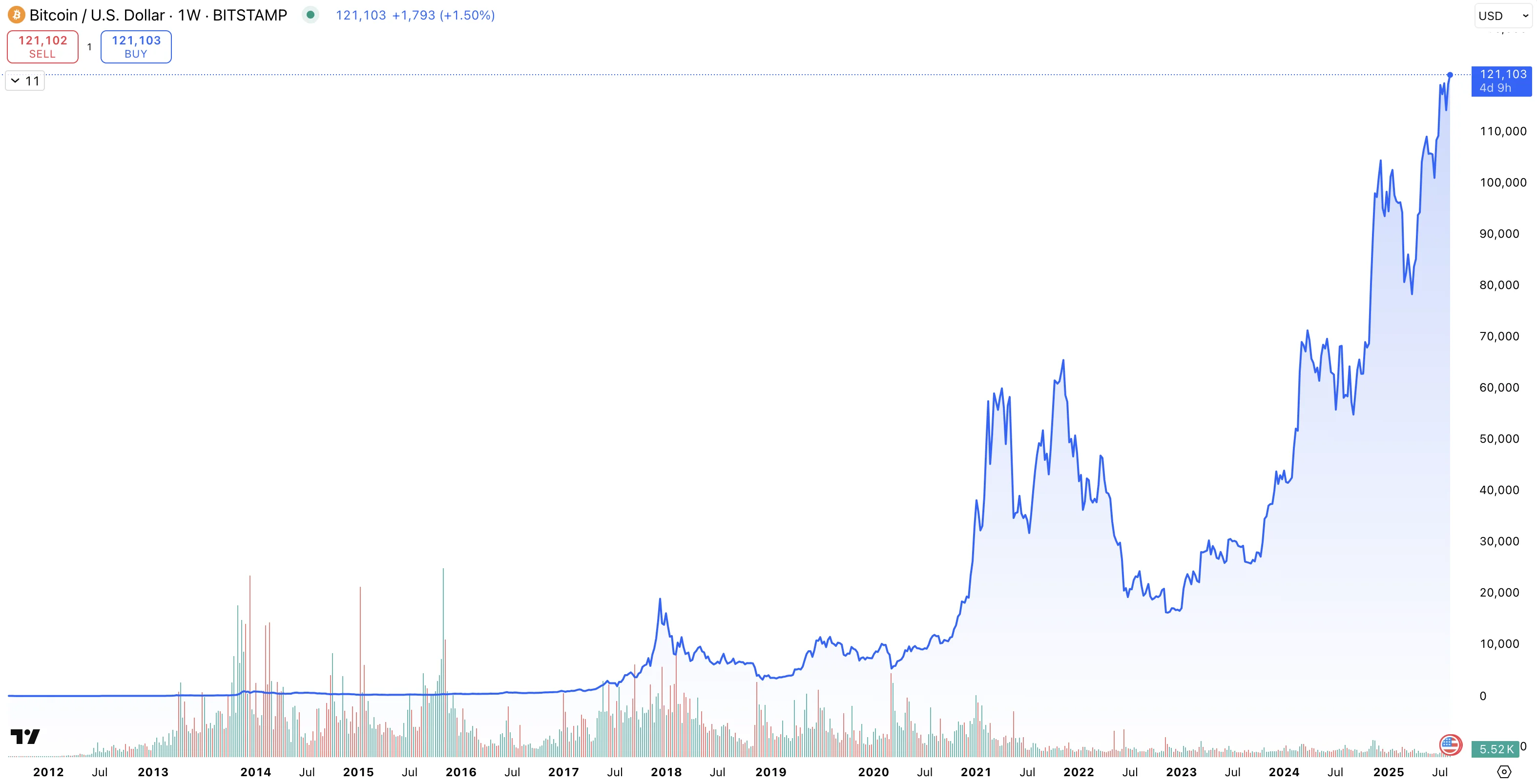 - Kurs augusti 2025: 121 103 USD