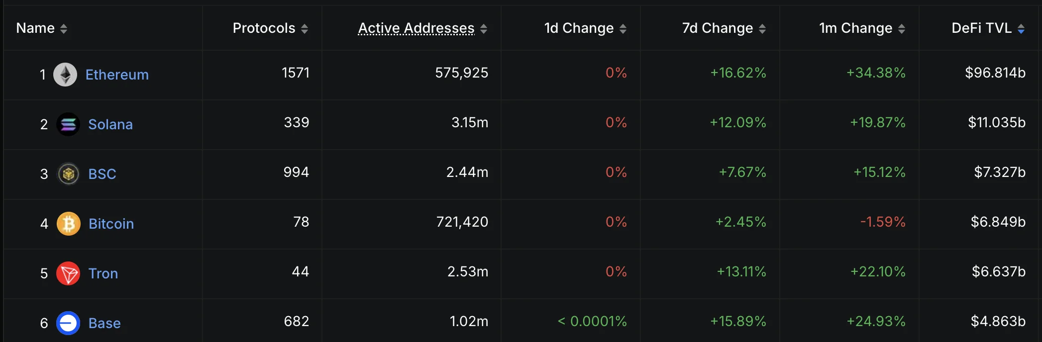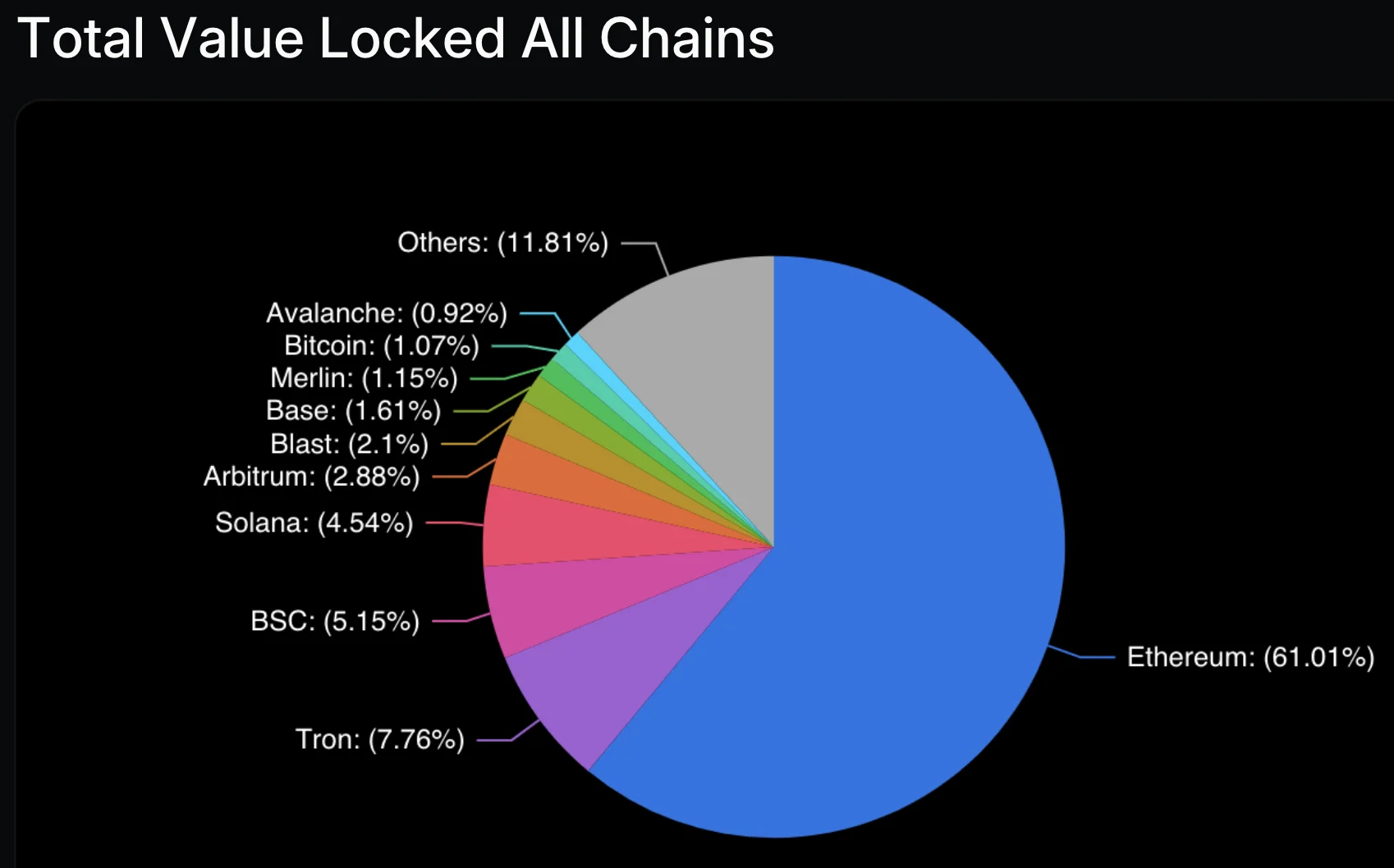 Nedan visas TVL för de sex största blockkedjorna i mitten av 2025. Det går tydligt att se att Ethereum har en mycket kraftig dominans. Detta med TVL på cirka 97 miljarder USD medan Solana kom på en andraplats med 11 miljarder USD.
