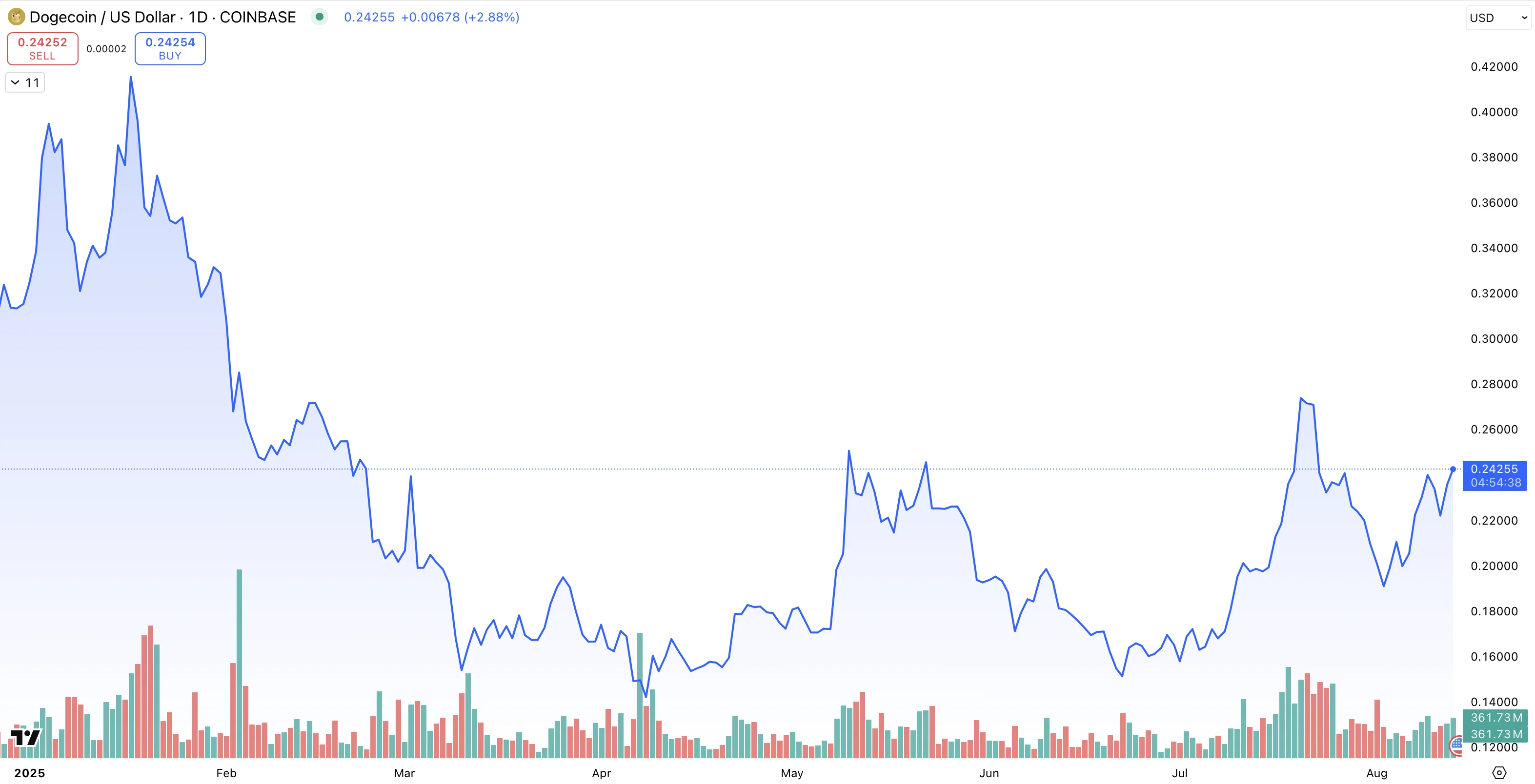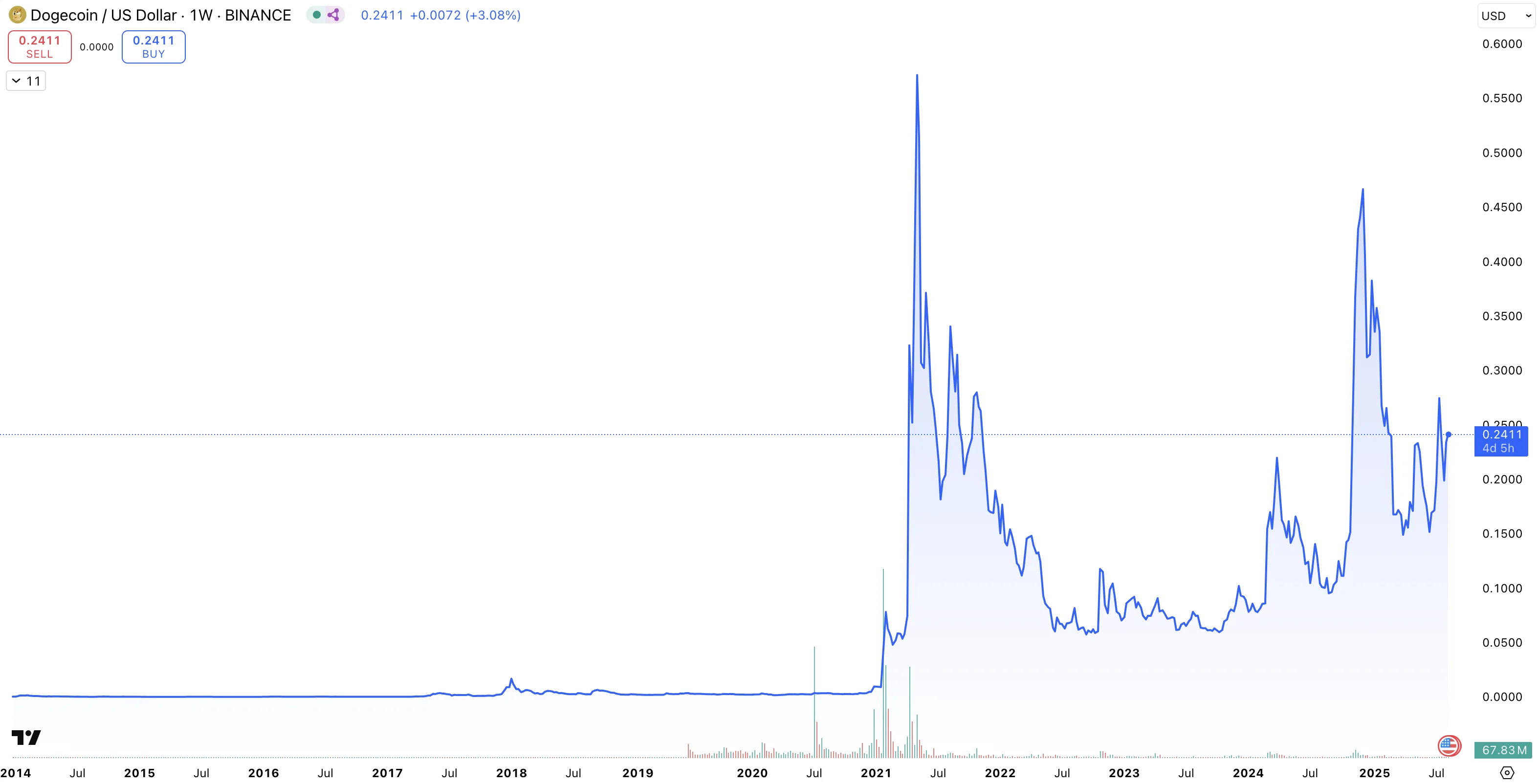 DOGE kursutveckling dec 2013 aug 2025: