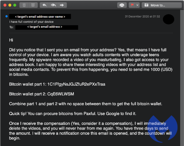 Utpressning kan ske på ett flertal olika sätt. Ett exempel är att kriminella skickar ut mängder av SMS och mejl till slumpvalda personer. I dessa anges att en programvara har installerats på personens dator och att allt som skett på datorn har filmats senaste månaden. Om inte betalning sker, med bitcoin, innan ett visst datum kommer allt material att delas på internet.