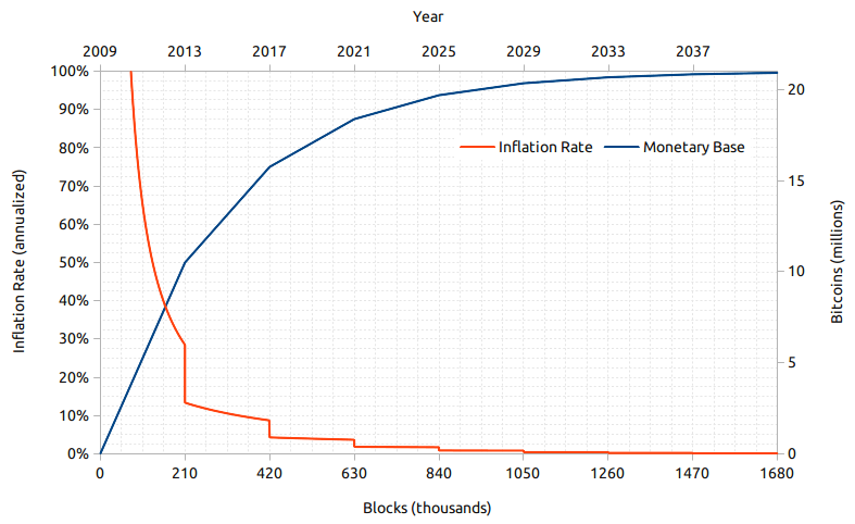 Bitcoin har, till skillnad från euro, en förprogrammerad utspädningseffekt som halveras med 50 % vart fjärde år. Grafen nedan visar antalet bitcoins i omlopp (blå linje) och dess inflationstakt (röd linje) över tid.