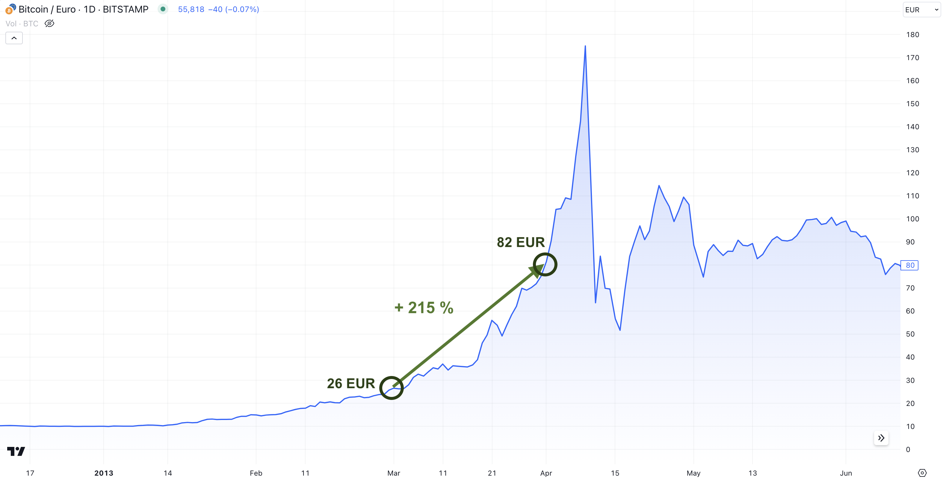 Bitcoin handlades i början av månaden till en kurs på 26 EUR. Kursen stängde slutligen på 82 EUR i slutet av mars. Det innebar alltså en ökning med ca 215 % på endast en månad. Kursrallyt fortsatte in i april då bitcoin nådde en kurs på drygt 175 EUR.