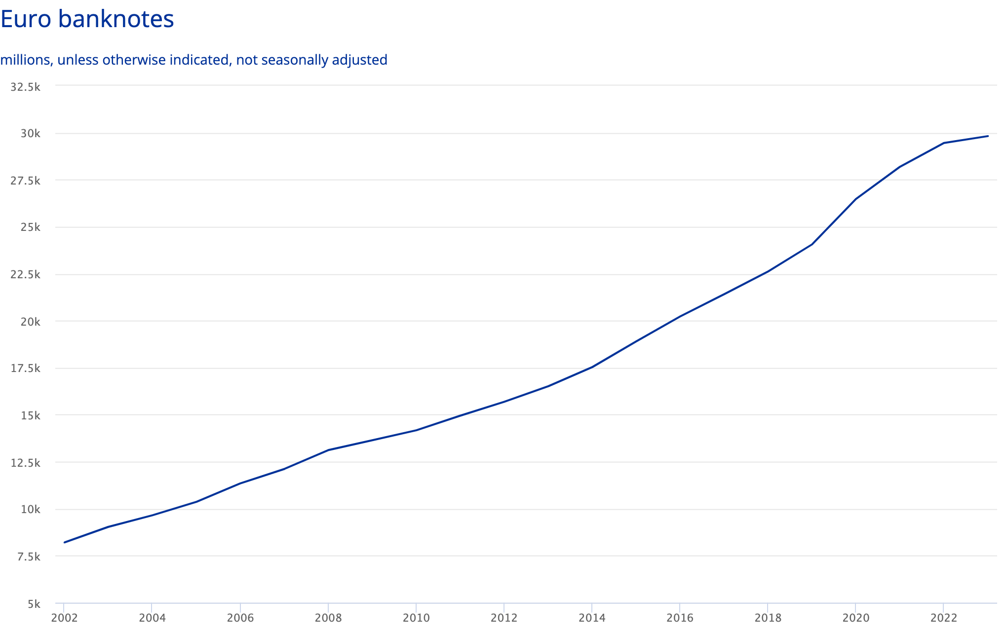 I början av 2002 fanns det drygt 8 miljarder eurosedlar. I början av 2025 fanns det nästan 30 miljarder sedlar i cirkulation, alltså nästan 4x fler. Det ger en ackumulerad utspädningseffekt på cirka 6 % per år.