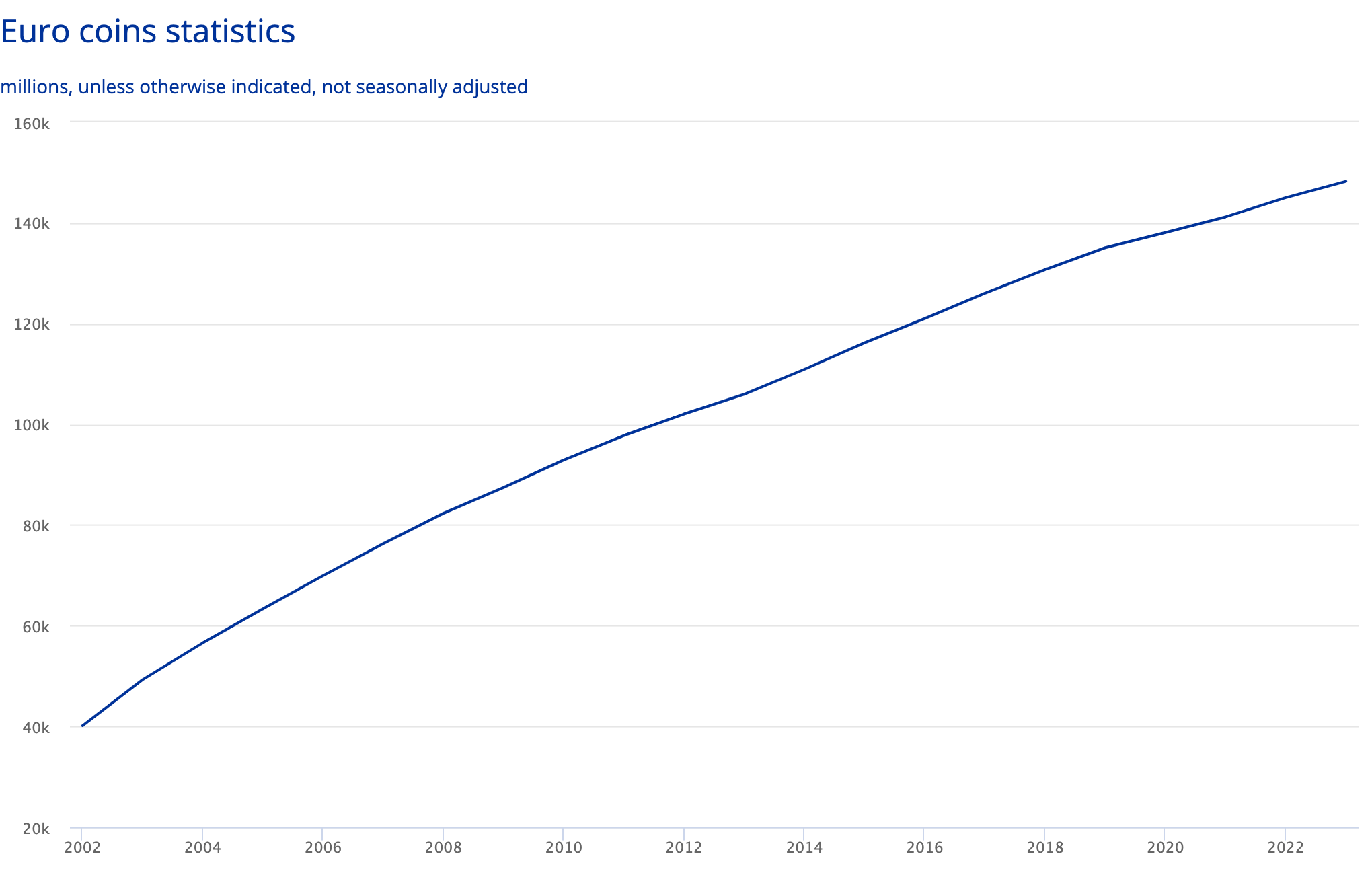 I början av 2002 fanns det totalt 35 miljarder euromynt i cirkulation. I början av 2025 fanns det 148 miljarder mynt, alltså drygt 4x fler. Det ger en ackumulerad utspädningseffekt på strax över 6 % per år.