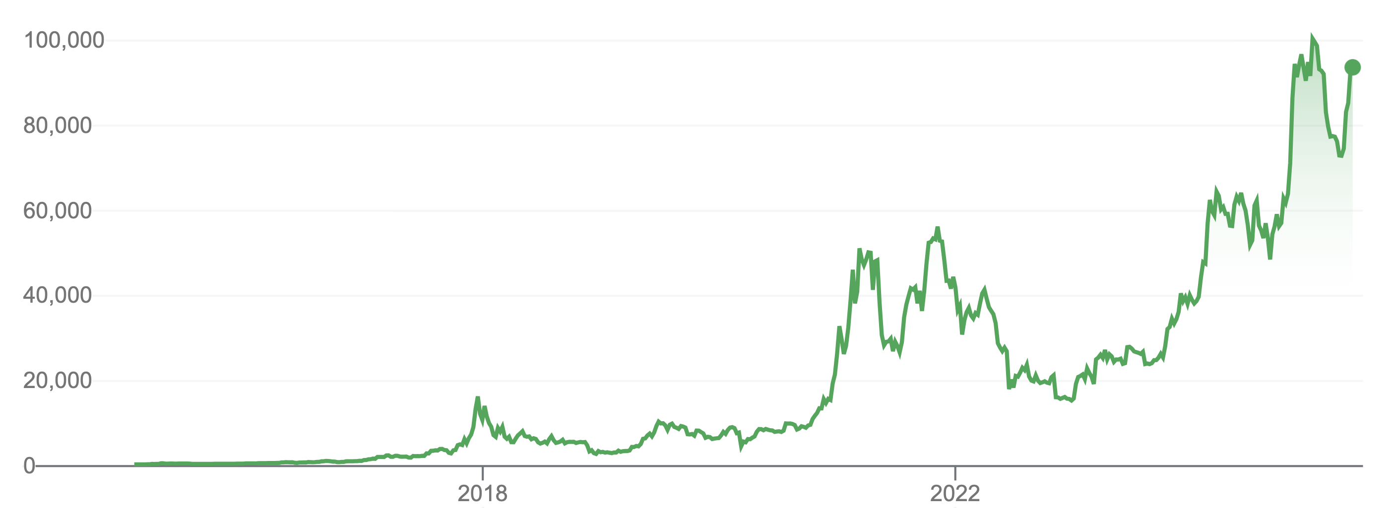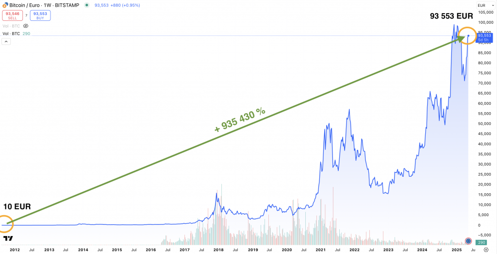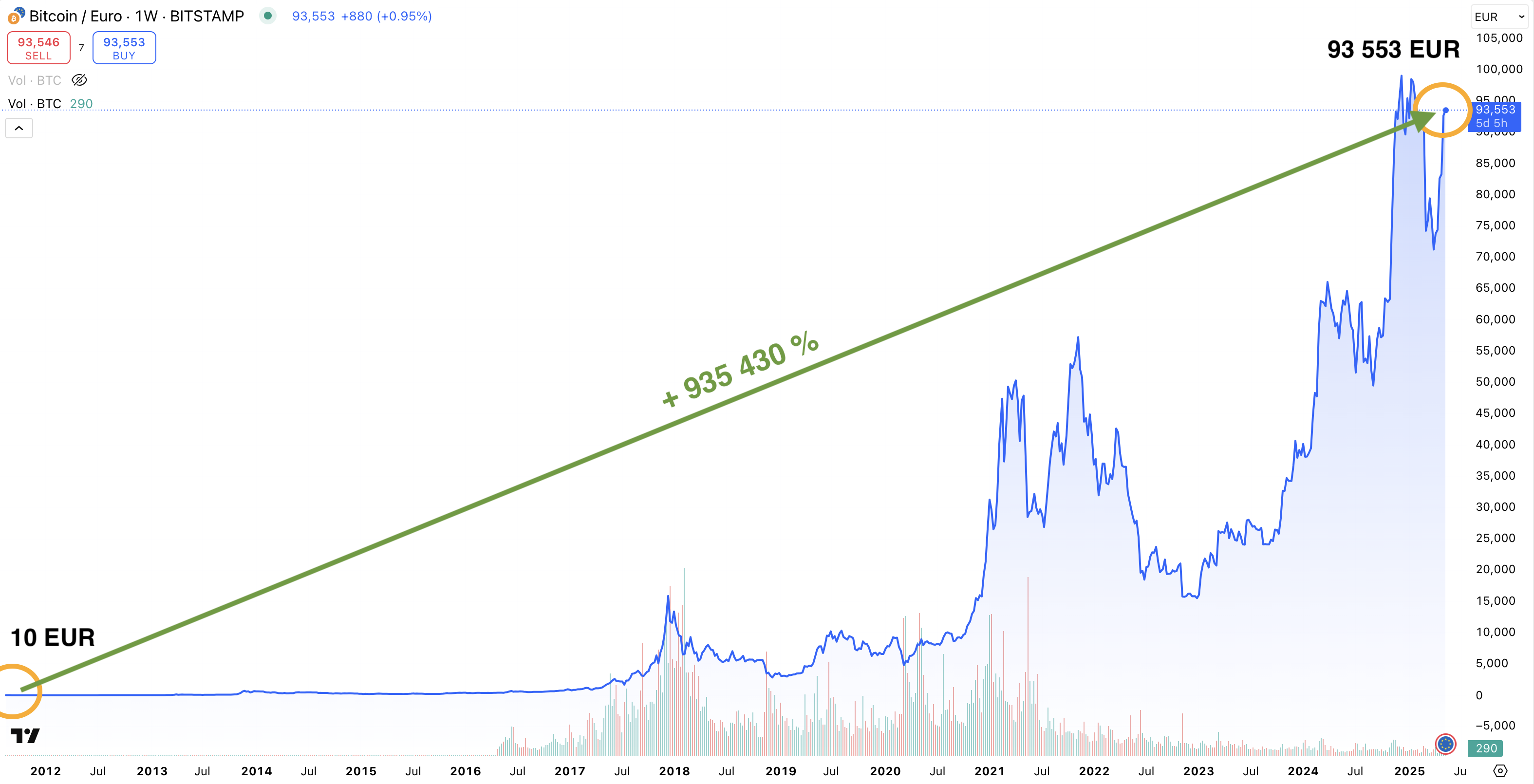 Den första offentliga transaktionen för bitcoin skedde till en kurs på 0.001 EUR, i november 2009. I mitten av 2025 handlades bitcoin till en kurs på 93 553 EUR. Det ger en ackumulerad genomsnittlig avkastning på cirka 92 % per år.