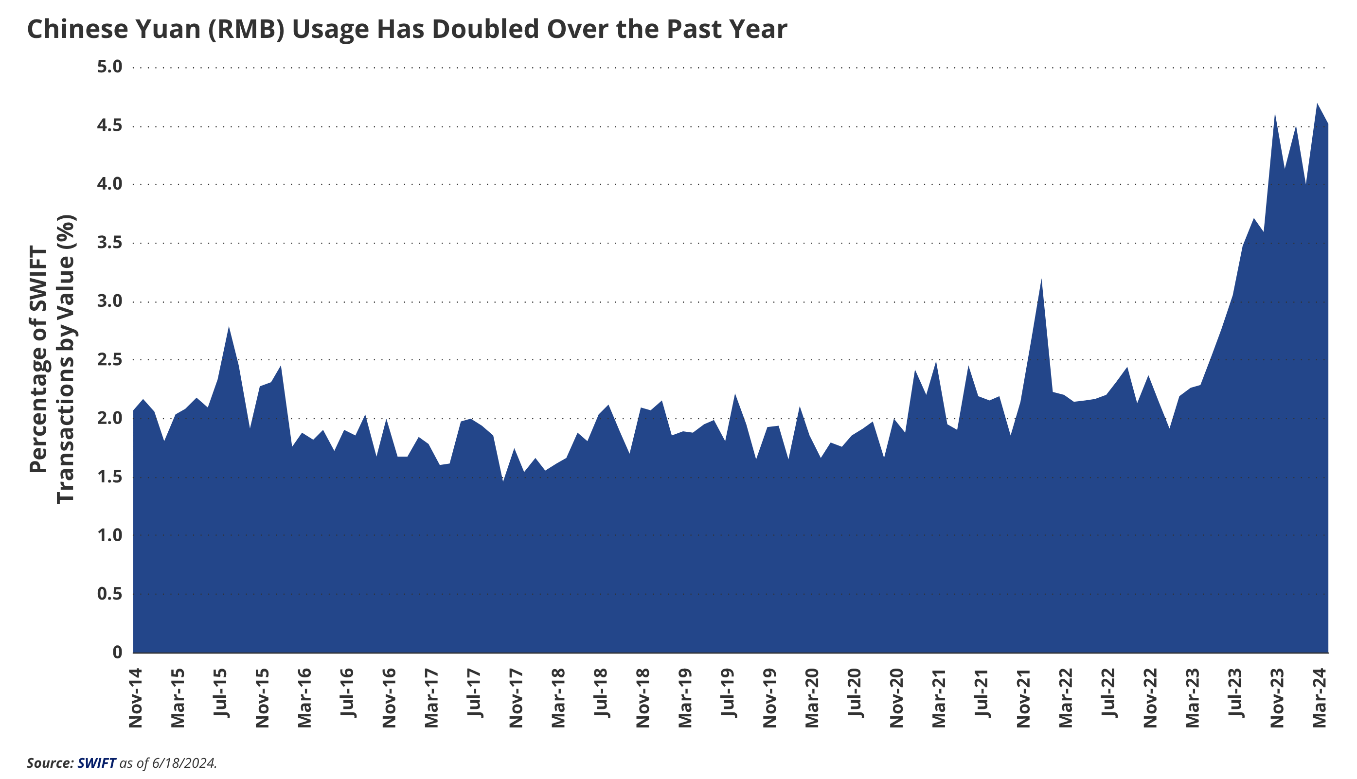 Tilltron till dem som sunda betalningsmedel och värdebevarare, hållna i centralbanker, har sjunkit. Resultatet är att nya alternativa betalningsmedel som exempelvis Kinas egen valuta, “RMB”, börjat användas inom internationell handel de senaste åren. Bilden nedan visar hur den kinesiska valutans andel inom internationell handel vuxit med 100 %, mellan 2014 och 2024.