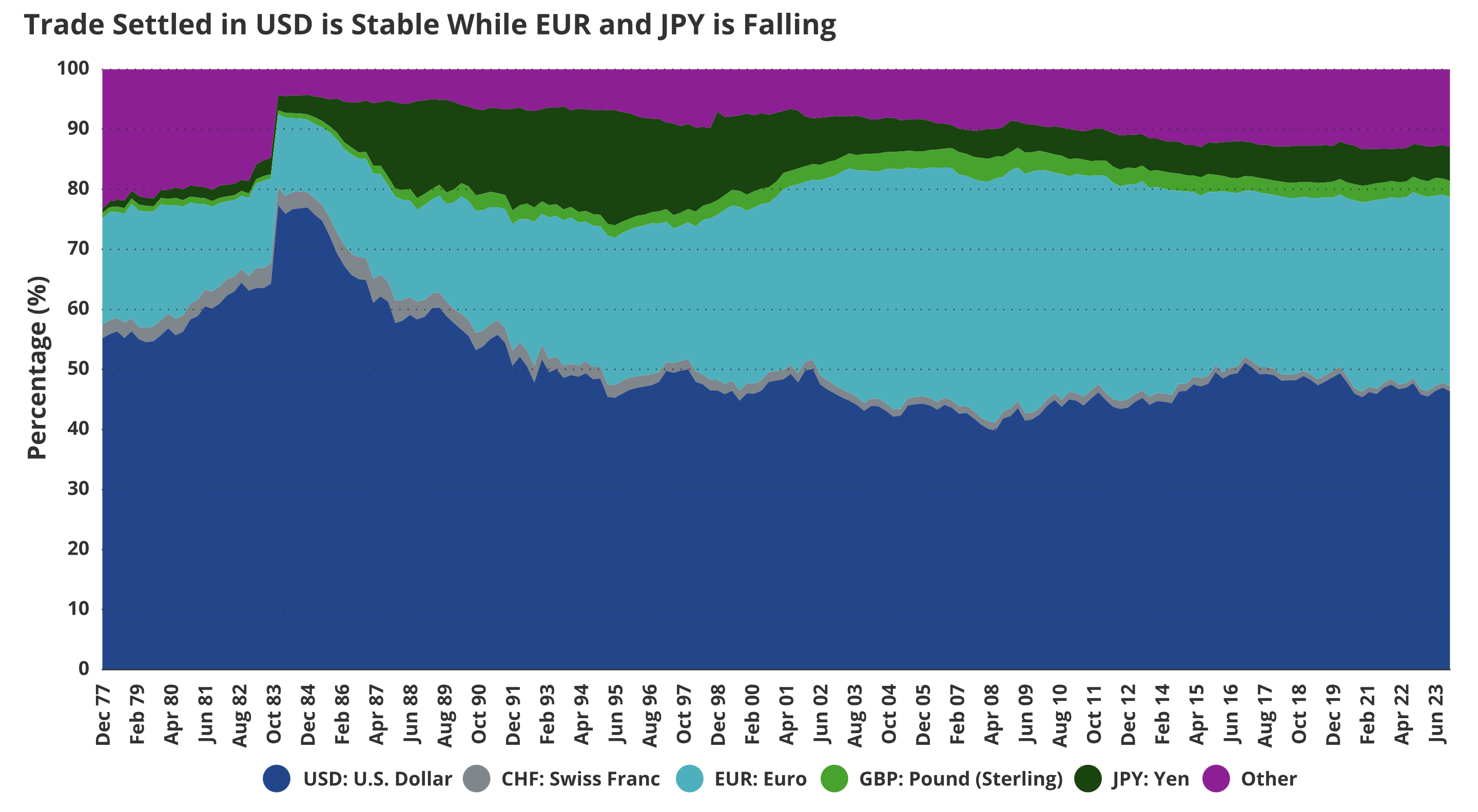 Bilden nedan visar dagens reservvalutors marknadsandel av den totala internationella handeln, mellan 1977 och 2023.