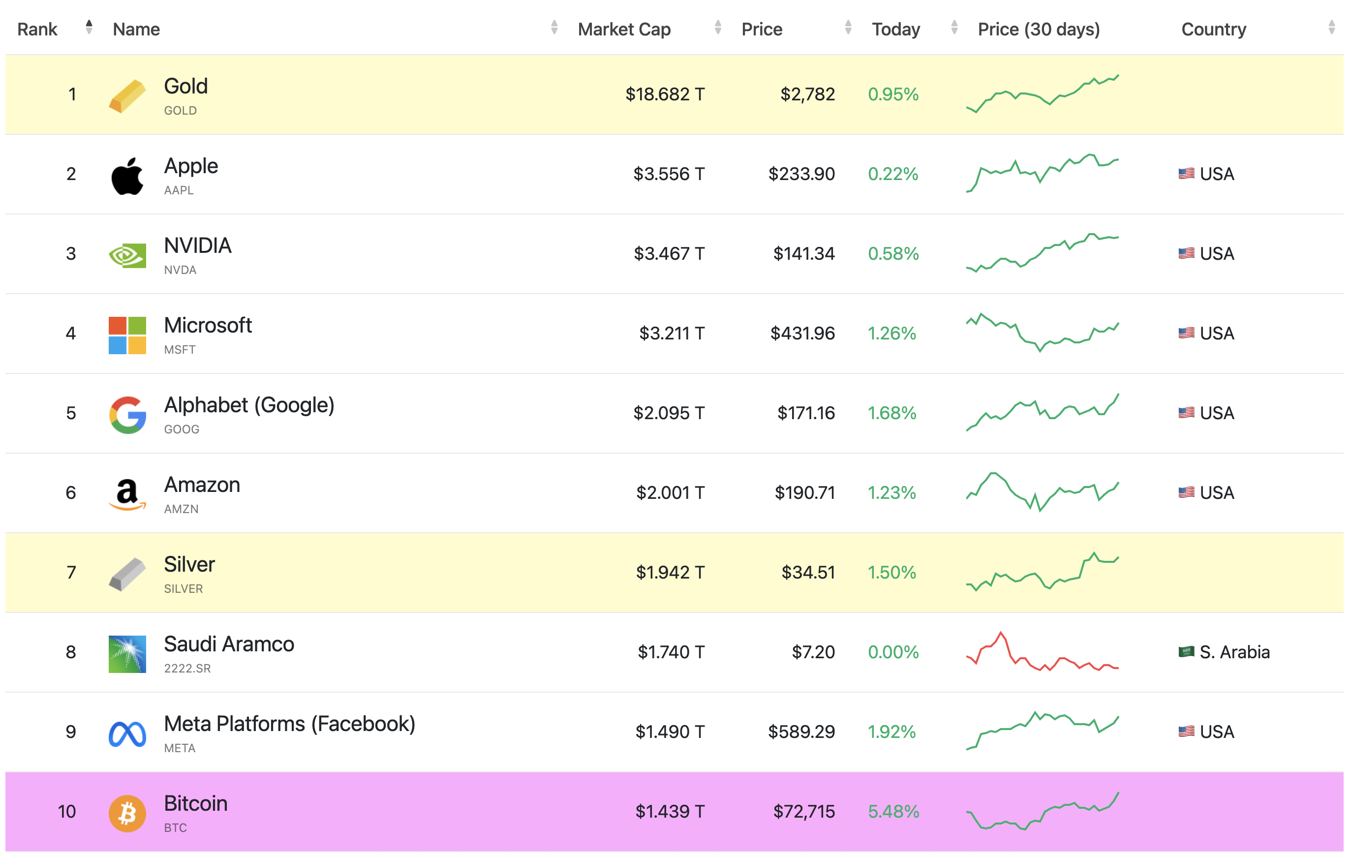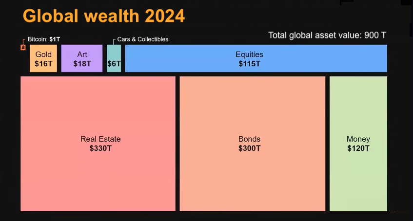 Bitcoin motsvarade 0.1 % av den globala kapitalmarknaden år 2024 (se den lilla orangea pricken längst upp till vänster. Majoriteten av den globala förmögenheten fanns då i aktie-, obligations- och fastighetsmarknaden.