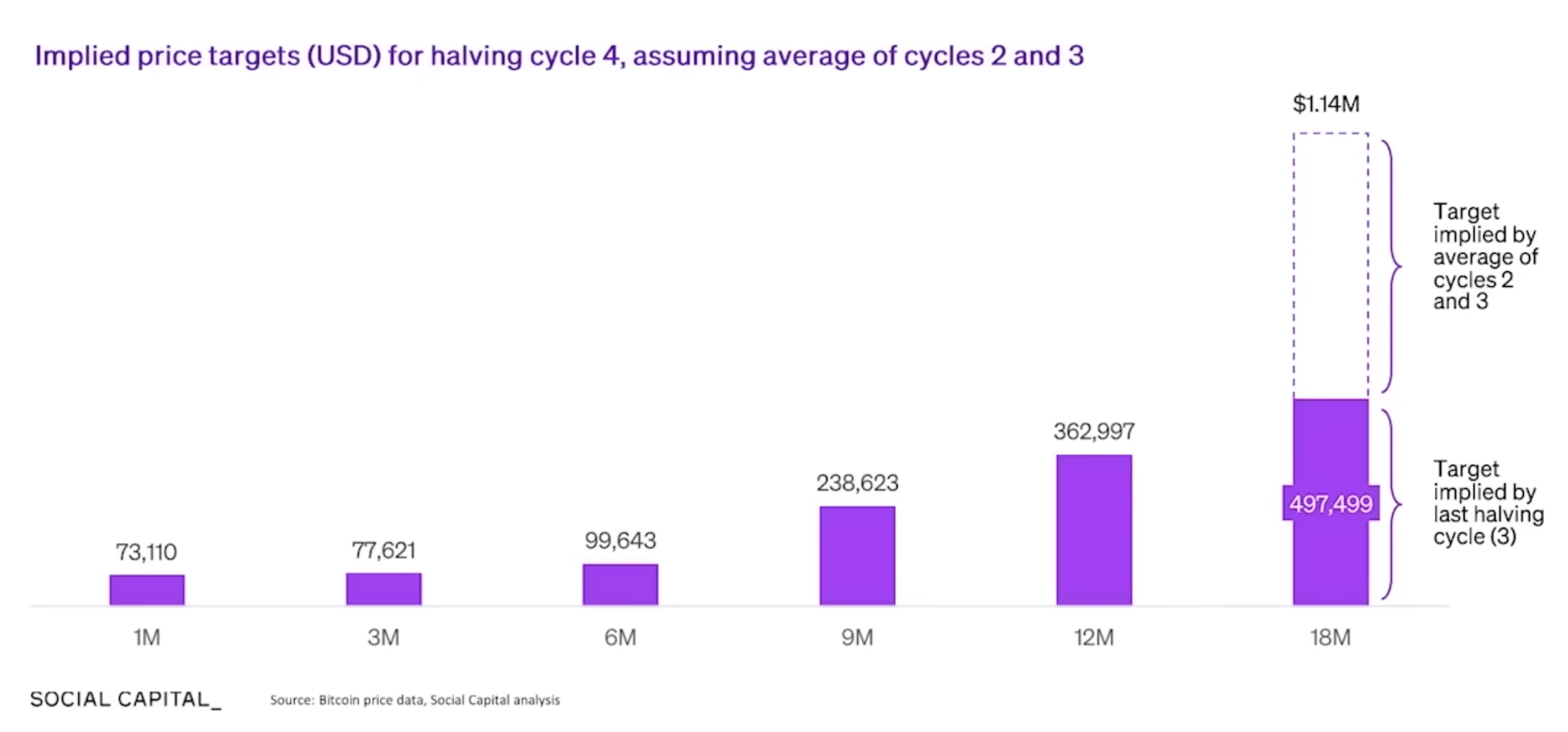 Genom att bortse från den första halveringen, som var den mest extrema, indikerar tidigare kursrörelser att bitcoinkursen kan komma att stiga som lägst till nästan 500 000 USD och som högst över 1 100 000 USD.