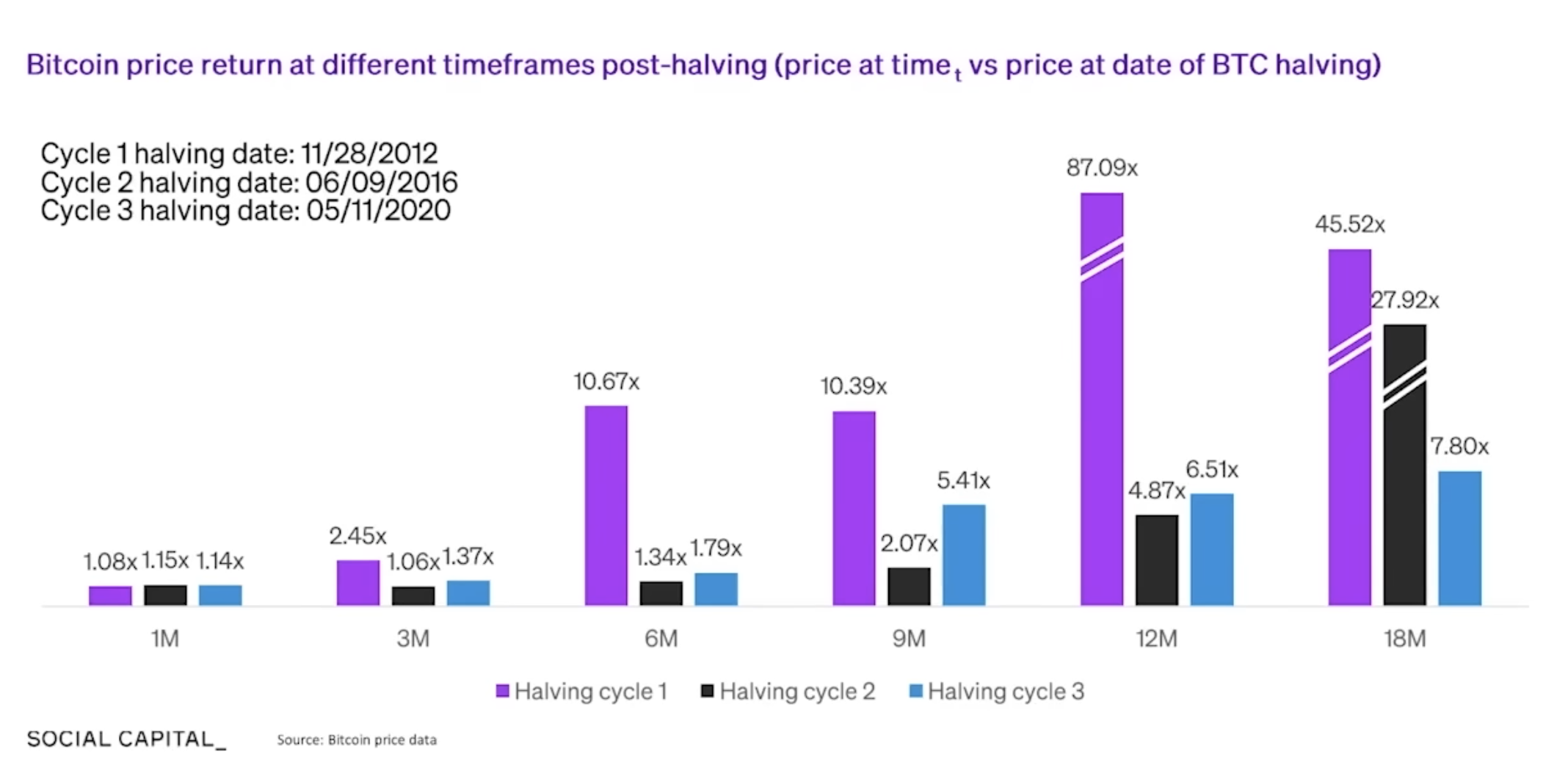 Palihapitiya börjar med att påpeka Bitcoins tidigare “halving-event” som sker ungefär vart 4:e år. Begreppet “halving” syftar till att antalet Bitcoins som minas halveras. Det gör Bitcoins utbud ännu mer begränsat eftersom utspädningseffekten blir lägre.