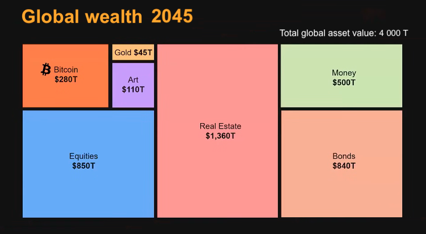 Saylor tror att Bitcoins andel av den globala kapitalmarknaden kan komma att att stiga från dagens 0.1 % till hela 7 %. Det skulle resultera i att fördelningen år 2045 ser ut enligt bilden nedan.
