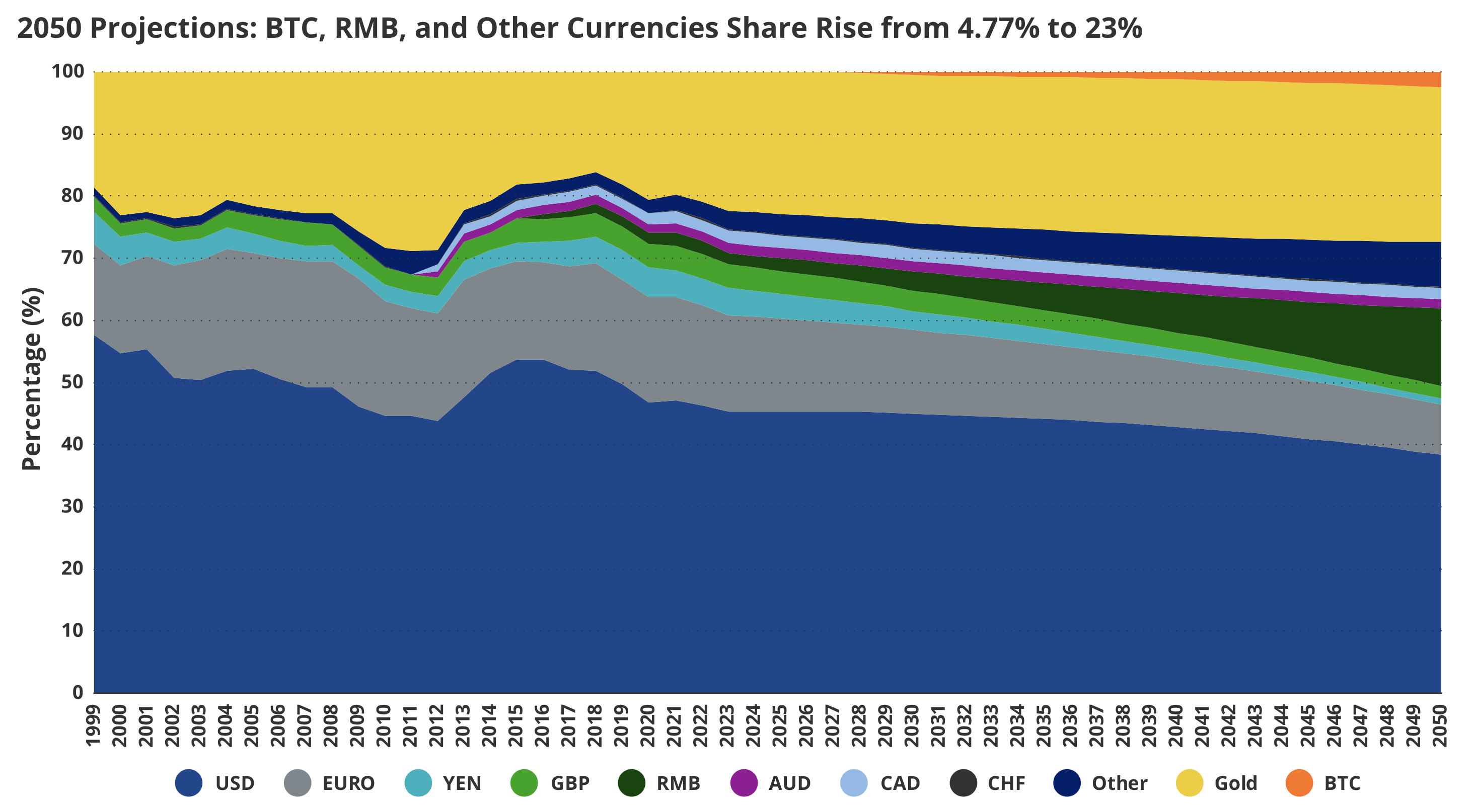 Bilden visar hur användningen av RMB och Bitcoin bör öka med tiden. Enligt VanEck kan Bitcoins marknadsandel inom internationell handel år 2050 komma att uppgå till så mycket som 10 %.