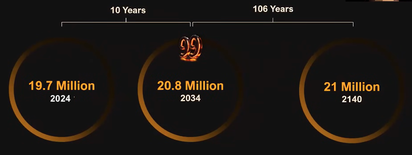 Saylor uppmanar till att investera i Bitcoin under de närmsta 10 åren. År 2034 kommer nämligen Bitcoin att ha nått ett totalt utbud på 20,8 miljoner. Det motsvarar 99 % av alla Bitcoins som någonsin kommer att minas. Därav namnet “Point 99”. De sista 200 000 kommer att minas de påföljande 106 åren.