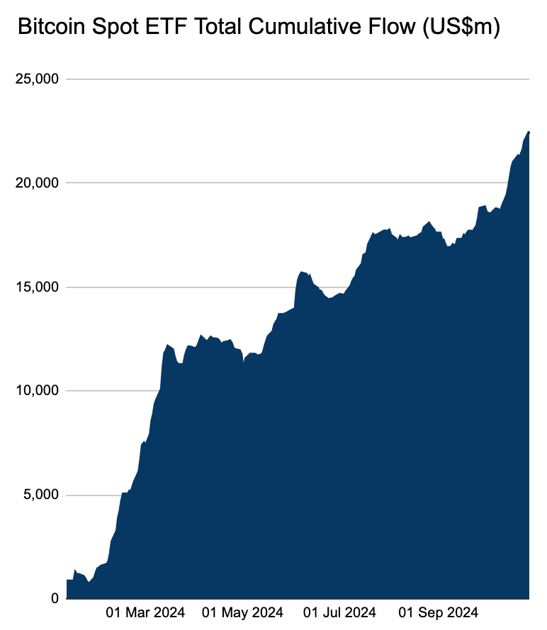 Sedan den 10:e januari, fram till den 28:e oktober har ETF:erna fått se ett inflöde på strax över 22 miljarder USD. Det är lika med ett genomsnittligt inflöde på cirka 112 miljoner USD per handelsdag. Under samma period har bitoinkursen växt med 50 %.