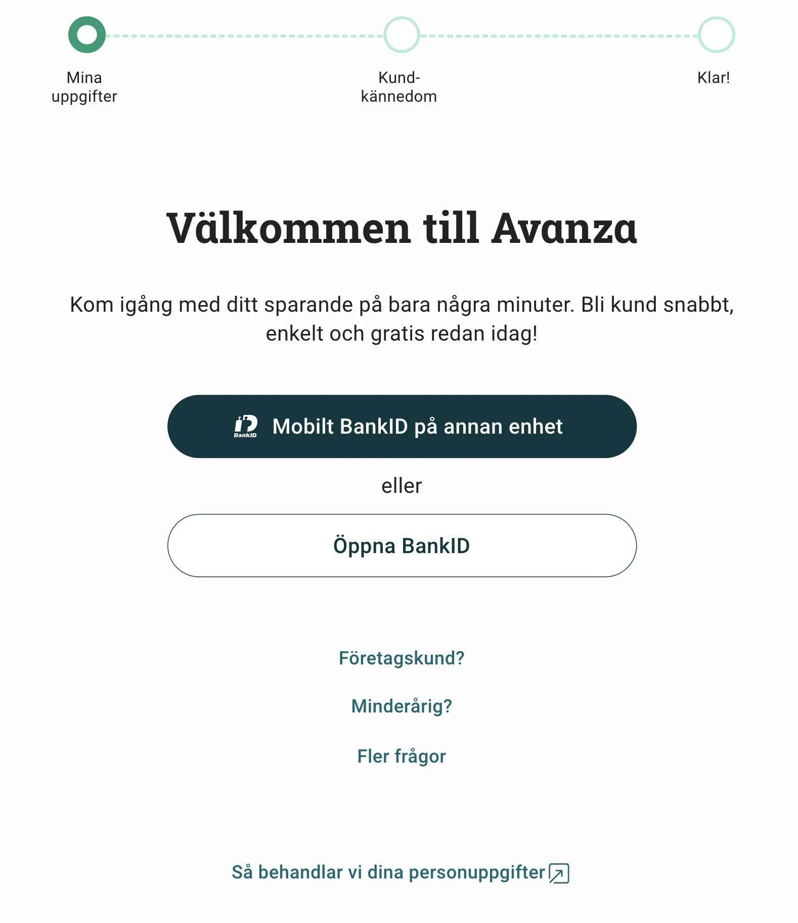 Börja med att gå till Avanzas webbplats. Väl inne på deras startsida klickar du på “Bli kund på 3 minuter” för att registrera ett konto.