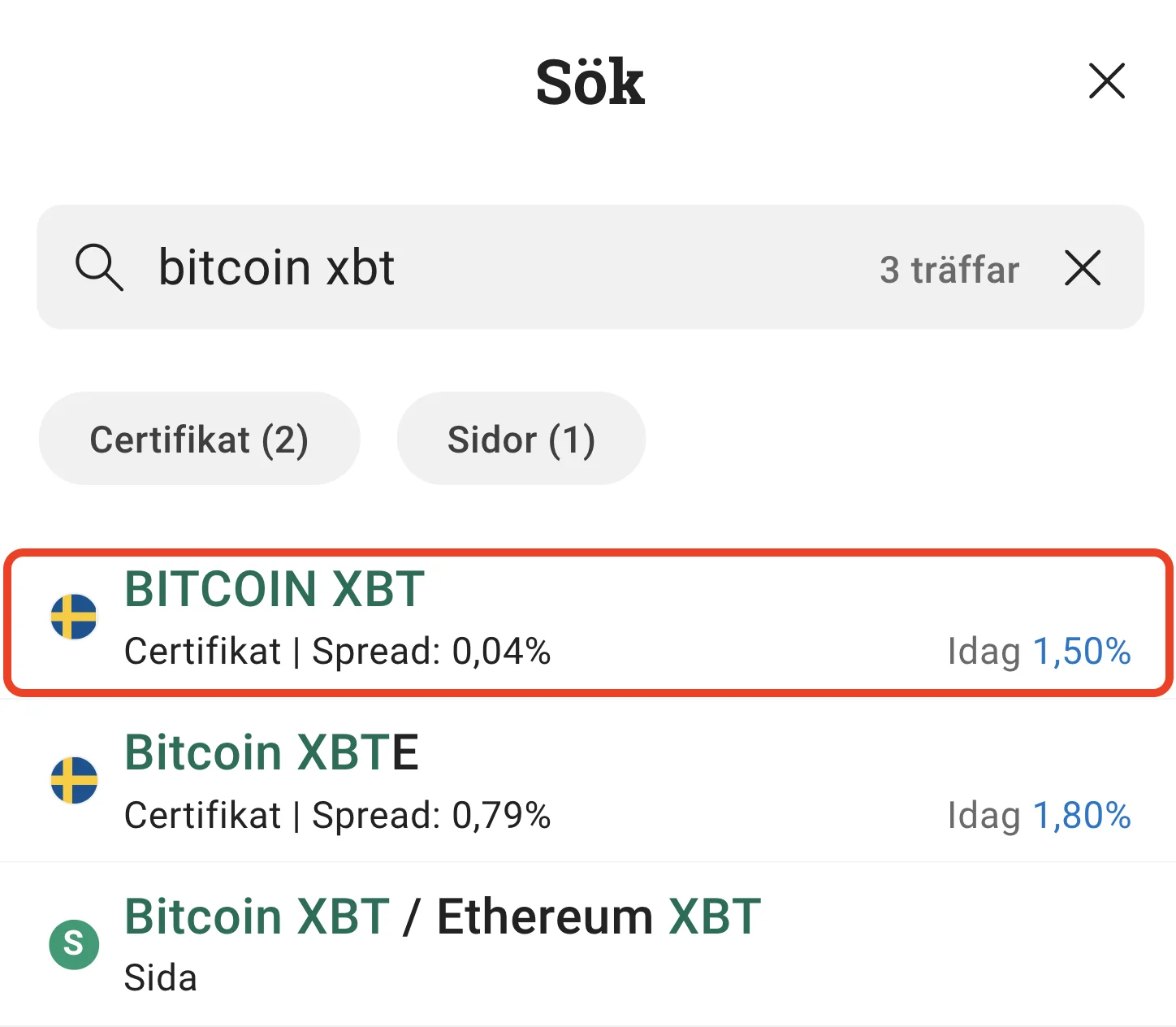 4. Sök och välj Bitcoin XBT