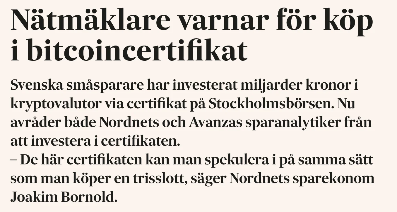 Under 2018 rapporterade SvD Näringsliv att både Avanzas sparanalytiker Henrik Senestad och Nordnets sparekonom Joakim Bornold avrådde sina kunder från att handla XBT certifikat. Joakim Bornold har också granskat XBT Provider och kommit fram till att företaget har varit slarviga i sin bokföring.