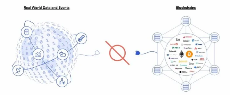 Det är däremot omöjligt att programmera ett kontrakt att ”betala 10X-coin om det regnar i New York imorgon”. Detta utifrån att information om nederbörd inte finns tillgängligt. Som bilden nedan illustrerar finns ingen kontakt mellan ”Real World Data” och ”Blockchains”.