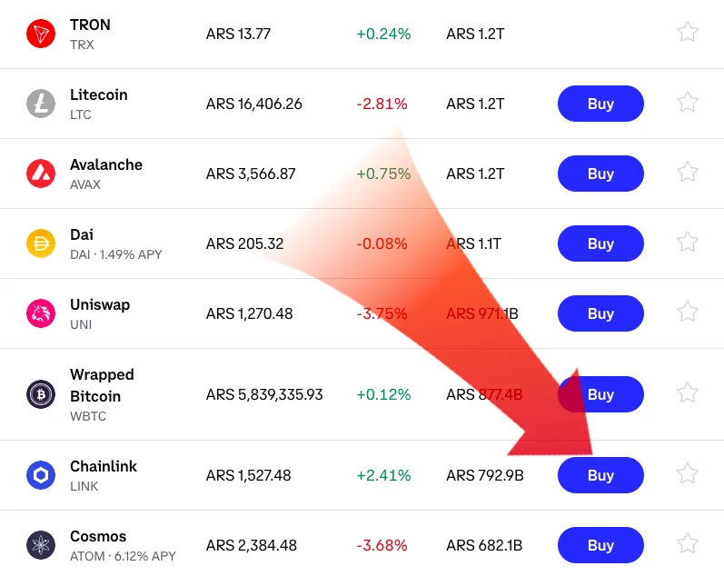 För att köpa LINK trycker du på “Trade” i navigeringsmenyn. Därefter kommer en detaljerad lista på tillgängliga kryptovalutor att visas med deras aktuella pris och kursförändring. Välj Chainlink genom att klicka på “Buy”. Välj hur stor summa du vill köpa för och sedan är det bara att genomföra köpet →