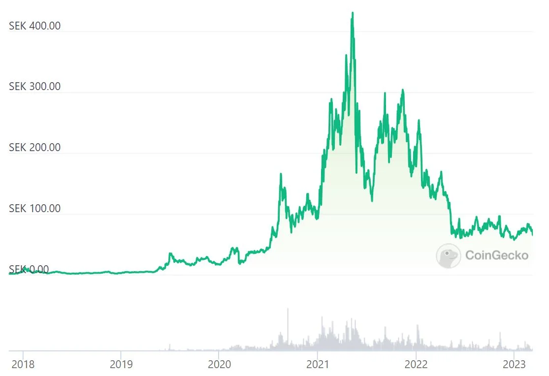 I början av januari 2020 kostade en LINK ca 25 kronor och i maj året efter var kursen på över 400 kronor. En uppgång med x16. I detta fall fick LINK alltså stark ”draghjälp” av den hype som var inom DeFi. Under samma period gick bitcoin från cirka 80 000 kronor till ca 480 000 kronor dvs. en uppgång med x6.