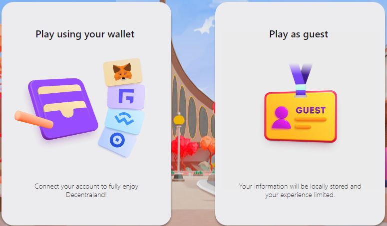 Välj därefter om du vill logga in som ”Gäst” eller spela med eget konto. Med eget konto menas att anslutning sker med en kryptoplånbok. Ditt konto blir därmed din Ethereumadress. Ett alternativ är att logga in som gäst men då visas enbart en begränsad del av den digitala världen. Det kan delvis jämföras med att spela ett demospel.