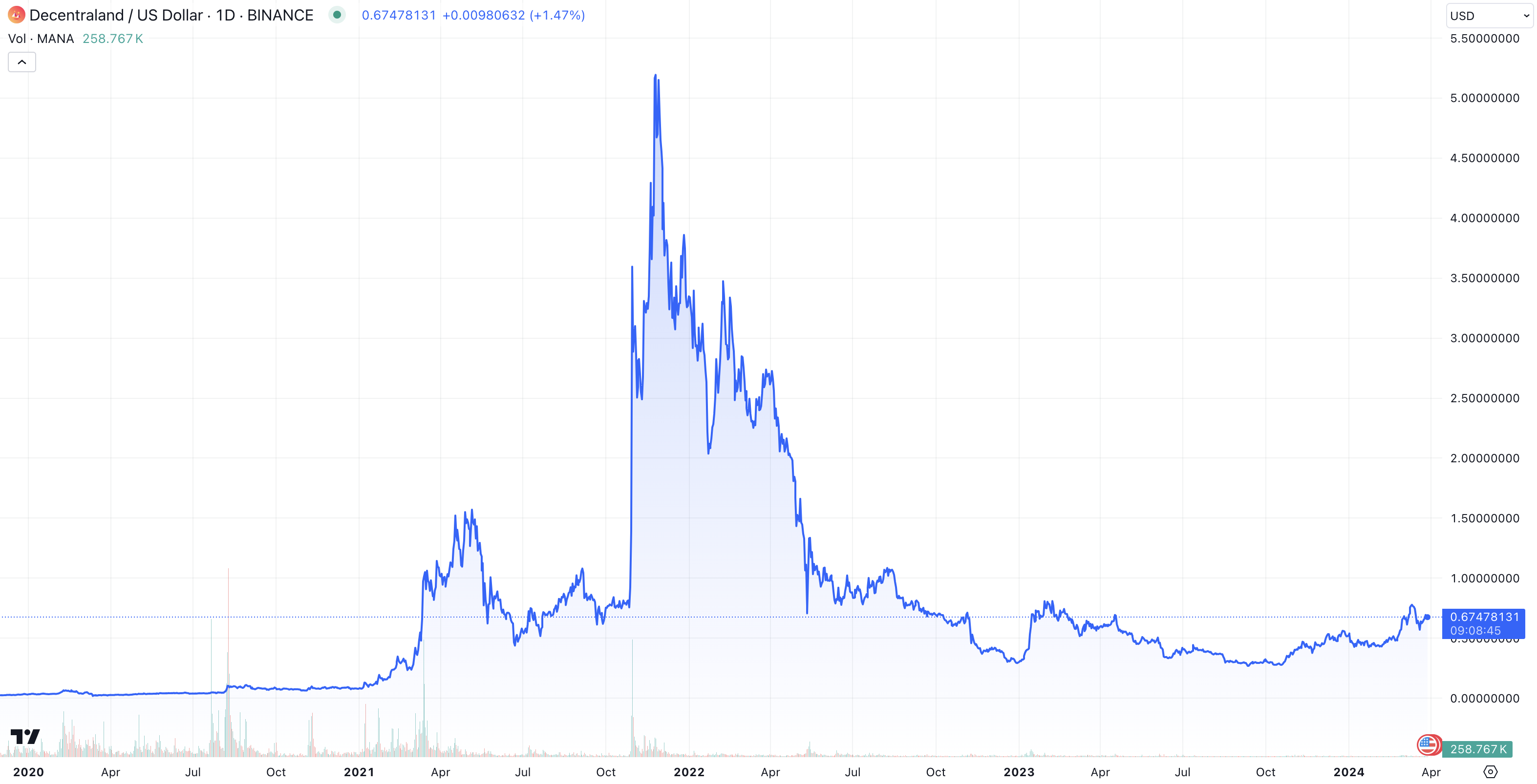 I november var en MANA värd strax över 5 USD. De som hade köpt i början av året hade fått en avkastning på drygt x70. Nedan visas kursen på MANA mellan januari 2020 och början av 2024.